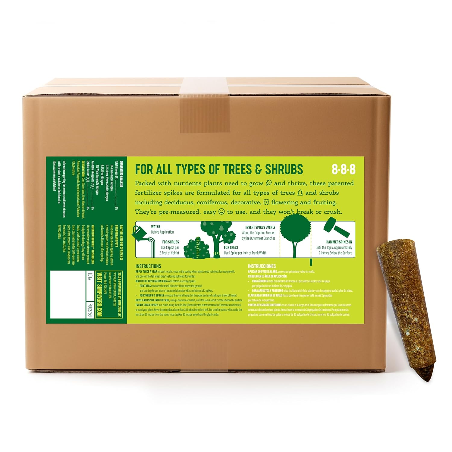- Formulated for All Types of Trees & Shrubs: The 8-8-8 formula -- 8% Nitrogen for vigorous plant growth and rich colors; 8% Phosphorus for healthy fruiting and flowering; and 8% Potassium for strong roots -- in these fertilizer plant food spikes provides ideal general nutrition levels for all types of deciduous, coniferous, decorative, flowering, and fruiting trees and shrubs.