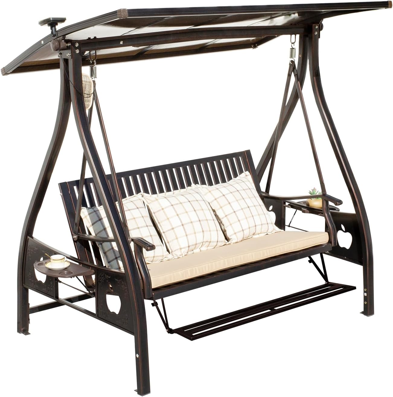 2/3-Seat Outdoor Patio Porch Swing with Adjustable Aluminum Alloy Canopy Solar Patio Swing Chair Bench with Footrest Side Cup Holder for Backyard Lawn (Elite Red Copper - 3 Seat)