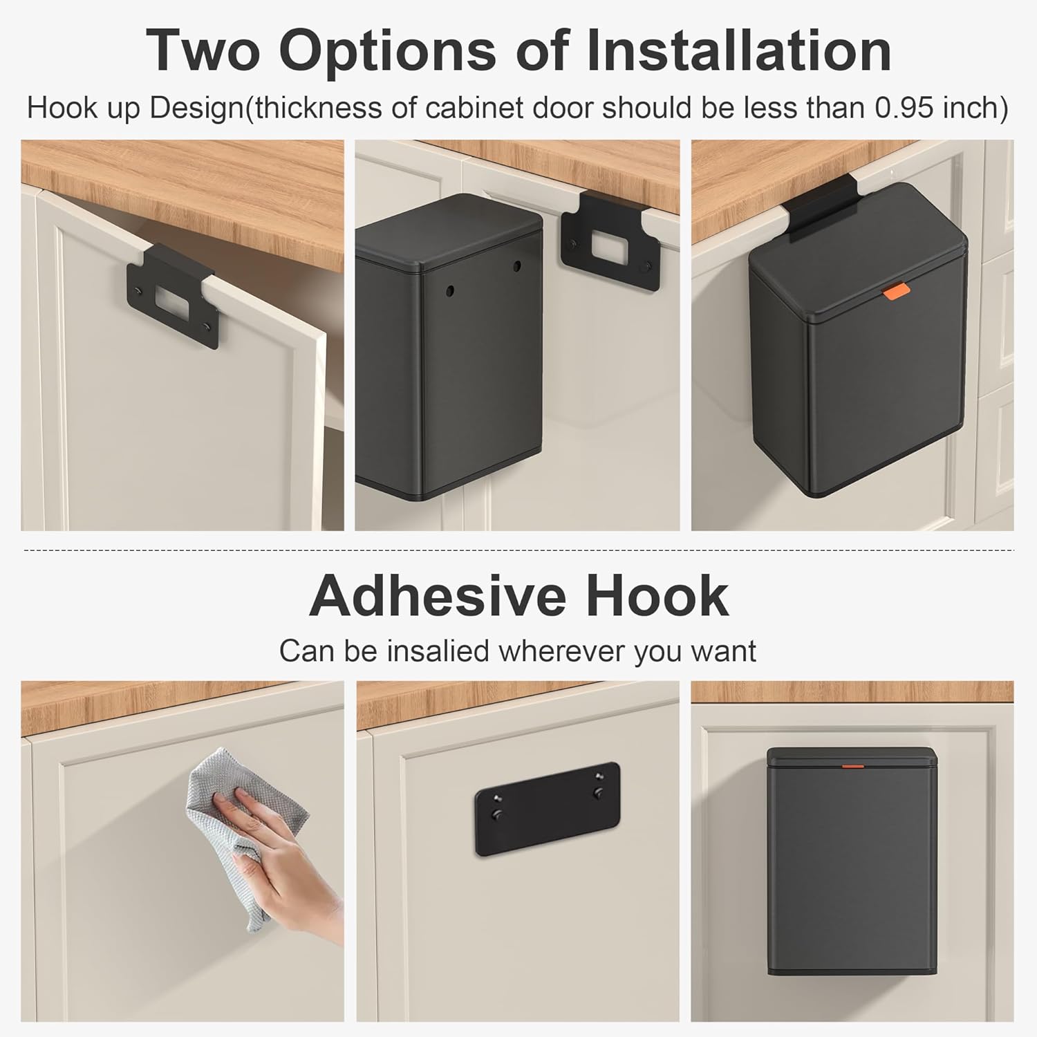 - 【WALL MOUNTED/COUNTERTOP/ UNDER SINK TRASH CAN】No need to bend over. The trash can provide Two opening and installation methods,Effortless and Fits for Most Cabinet Doors, Pantry Doors. The thickness of door should be less than 0.98" (2.5 cm). Small trash can can also be glued on kitchen or bathroom wall or under the sink