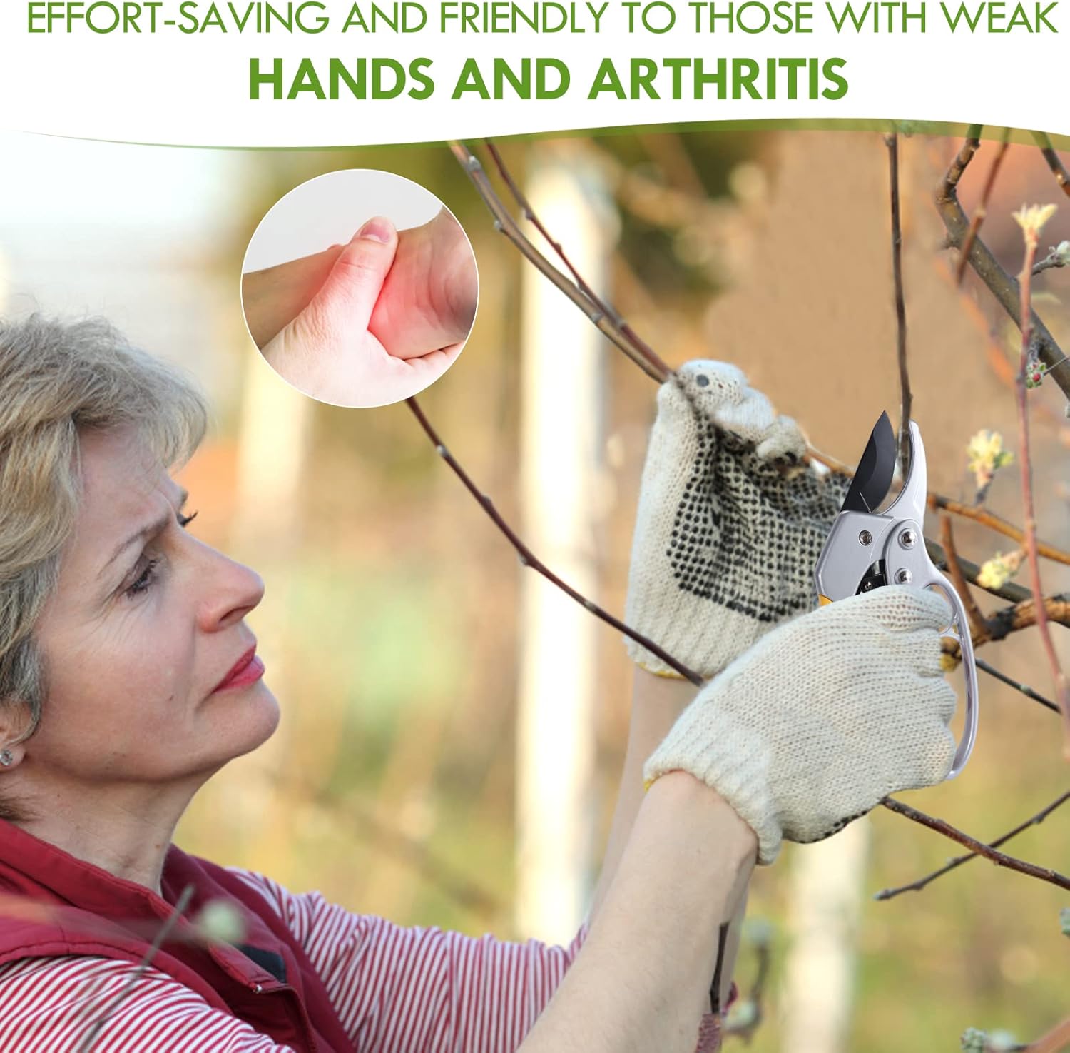 - đź’“PRUNING THICK AND THIN BRANCHES IS ALSO EXCELLENT: Our professional garden scissors handheld are great for pruning and general gardening tasks. The ratchet structure and the built-in return spring make us efficient and effortless, making it easy for us to trim, even for arthritis sufferers or those with weak hands