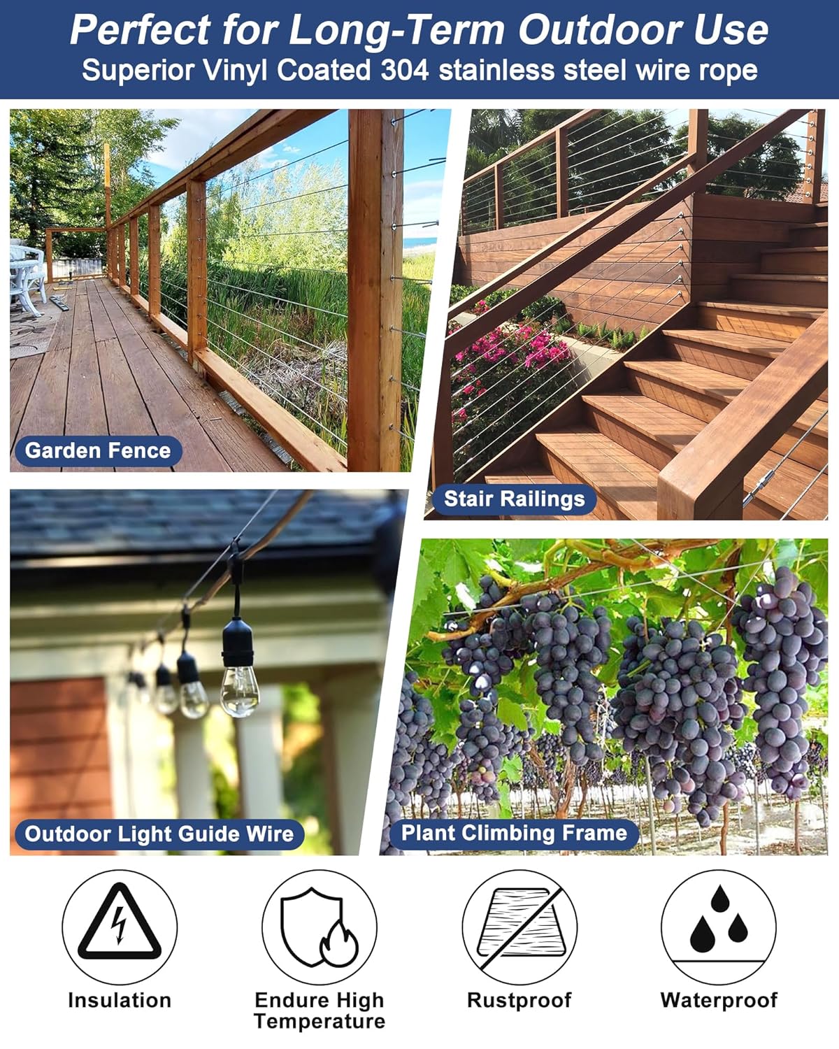 - [Effortless Installation] Say goodbye to complicated setups! Our vinyl coated stainless steel cables are a breeze to install. Simply cut the desired length using cable cutters, secure the buckle head with M3 thimbles and aluminum sleeves, and utilize the included tools for various scenarios