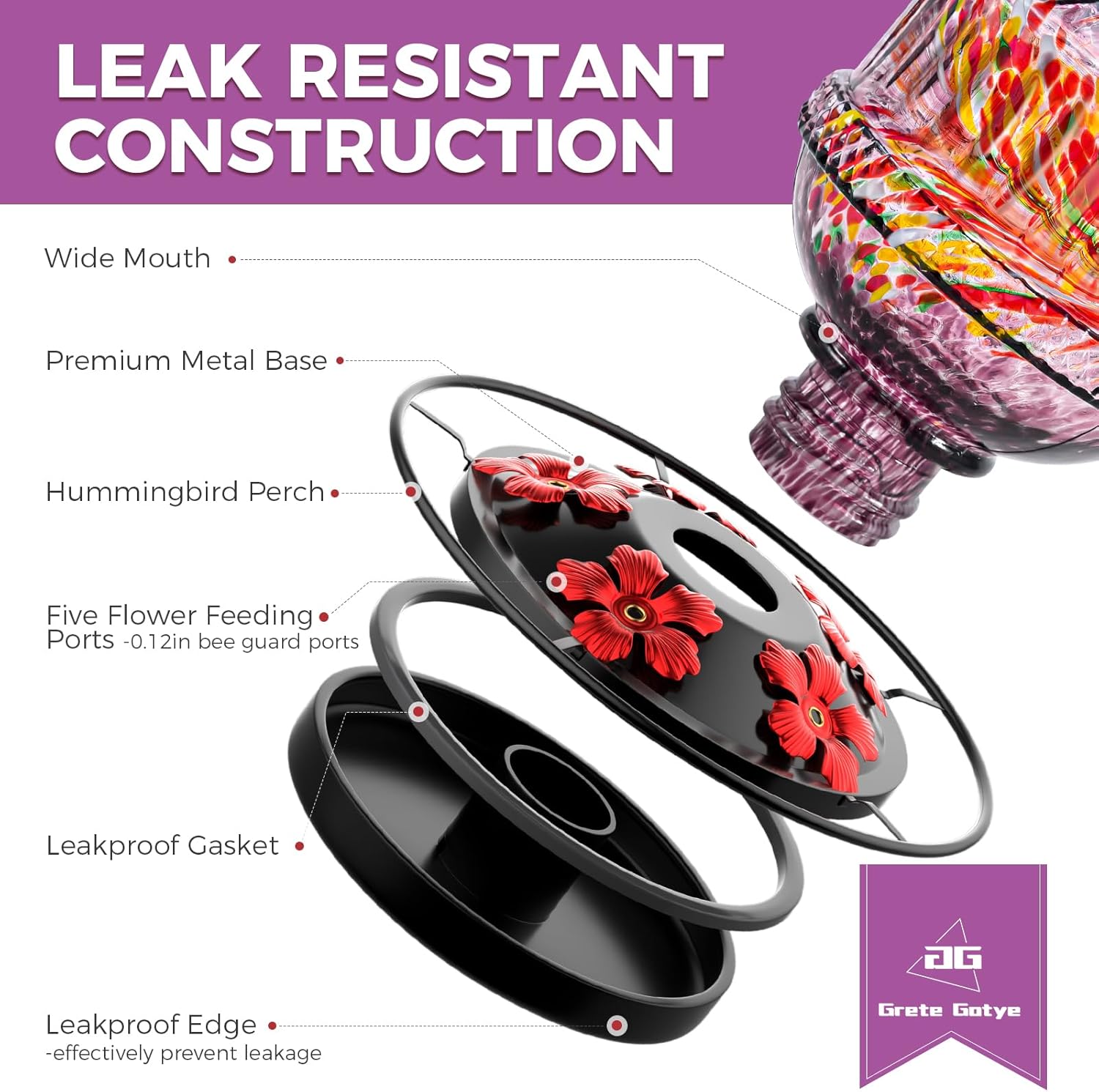 - 💧LEAKPROOF FUNCTION: Built-in durable gasket, unique design makes base connection proper and seamless, even when the hummingbird feeders for outdoors hanging are shaken by wind or birds perching on it. After filling the container and screwing it onto the base, flip it over and hang it on a tree/deck hook/shepherd's hook/hangers/window hook.