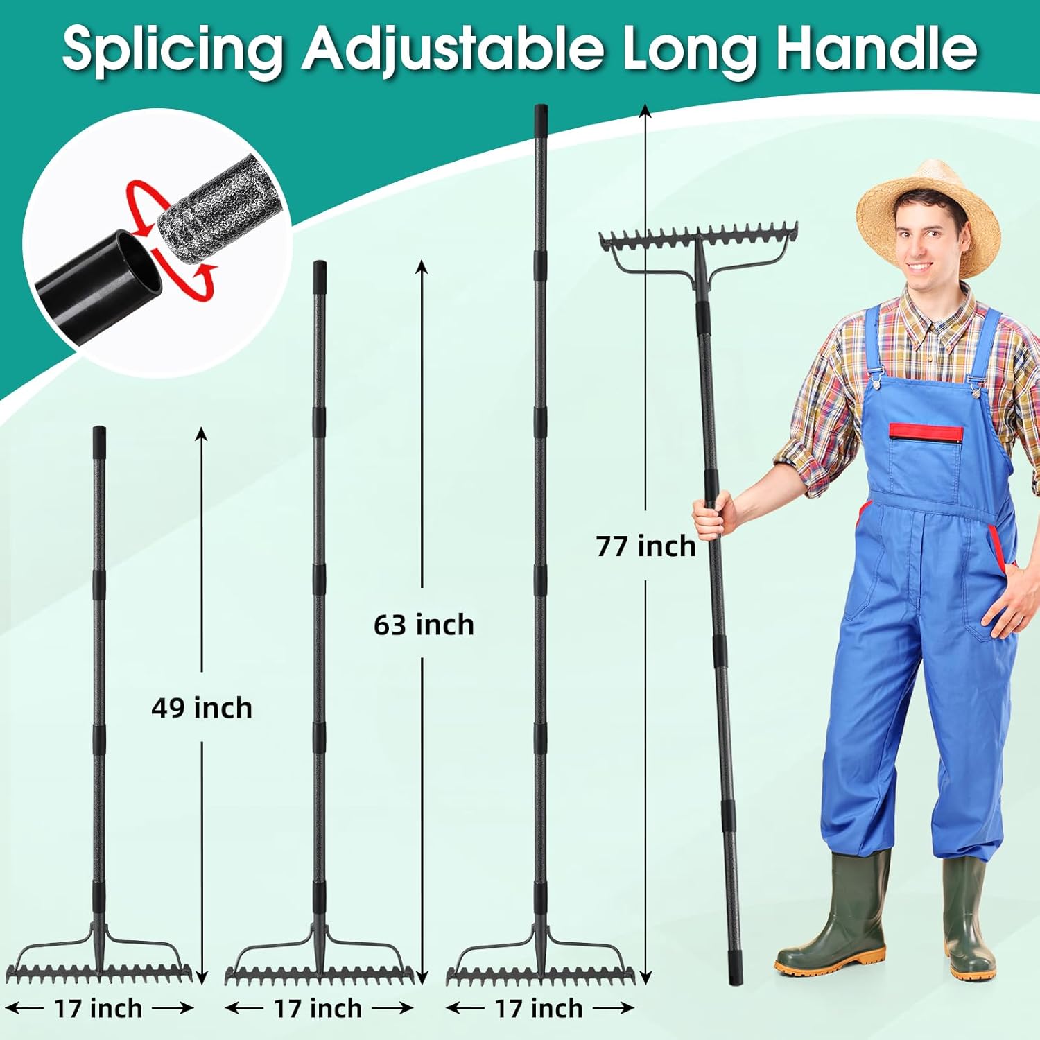 - 17-Tine Design for Maximum Efficiency:The sharp metal tines make it easy to dig into compacted soil, break up hard dirt, and evenly distribute materials like compost, mulch, and gravel, ensures fast and efficient coverage, helping you complete yard work in less time