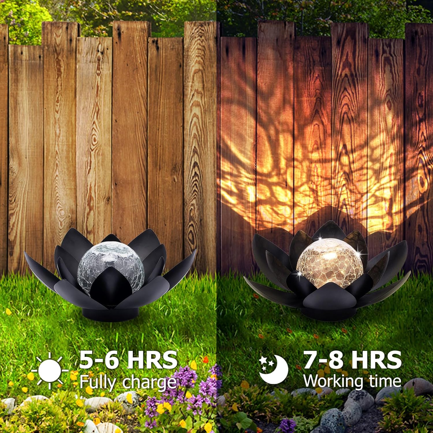- You just need to leave the switch ON when you use it for the first time. The lotus outdoor solar garden Light is better to place under the sun to absorb the solar energy. It will emit the night for 8 hours at night.The size is 9.84*9.84*3.54 inches, so that you can place it anywhere on your needs.
