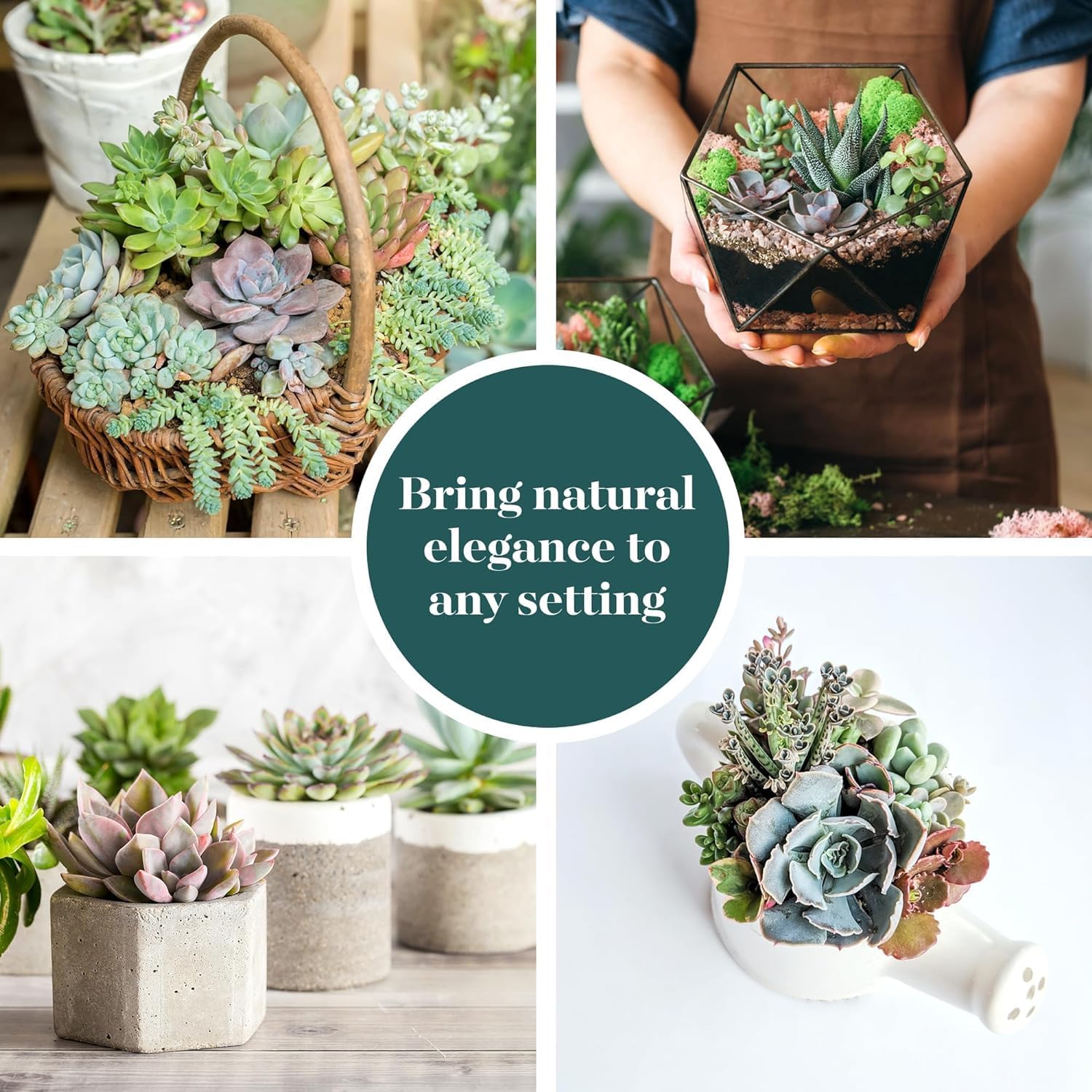 - Care Guidelines: Succulents are known for their easy care requirements. Simply place them in areas with soft high sunlight areas, and water infrequently, allowing the soil to thoroughly dry between waterings. Succulents will thrive with optimal fresh air flow.