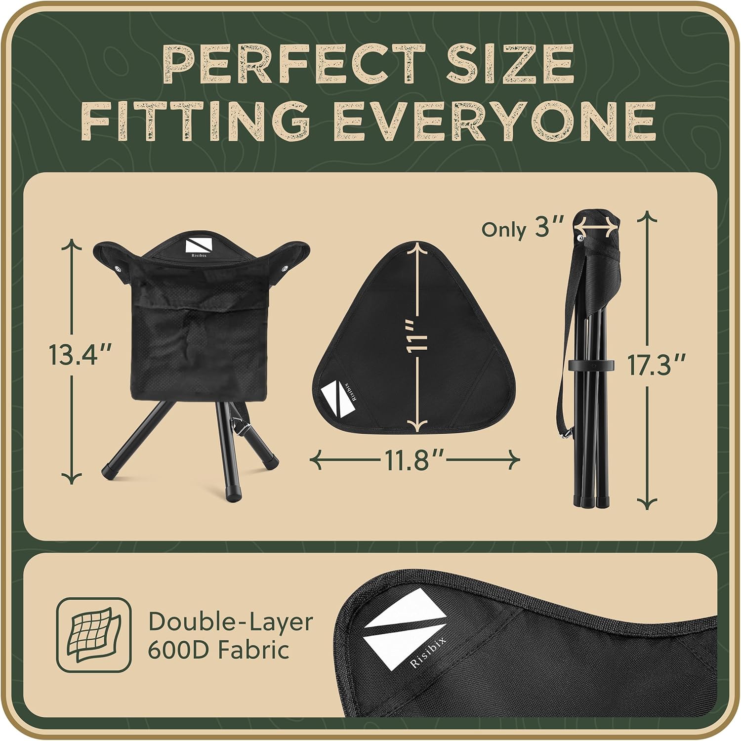 - β ULTRA-PORTABLE DESIGN: The tripod hunting chair folds down to an impressively compact 17.3β x 3β size and goes neatly onto a backpack. Perfect for camping or fishing, the tripod camping chair is the ideal lightweight companion for all your journeys