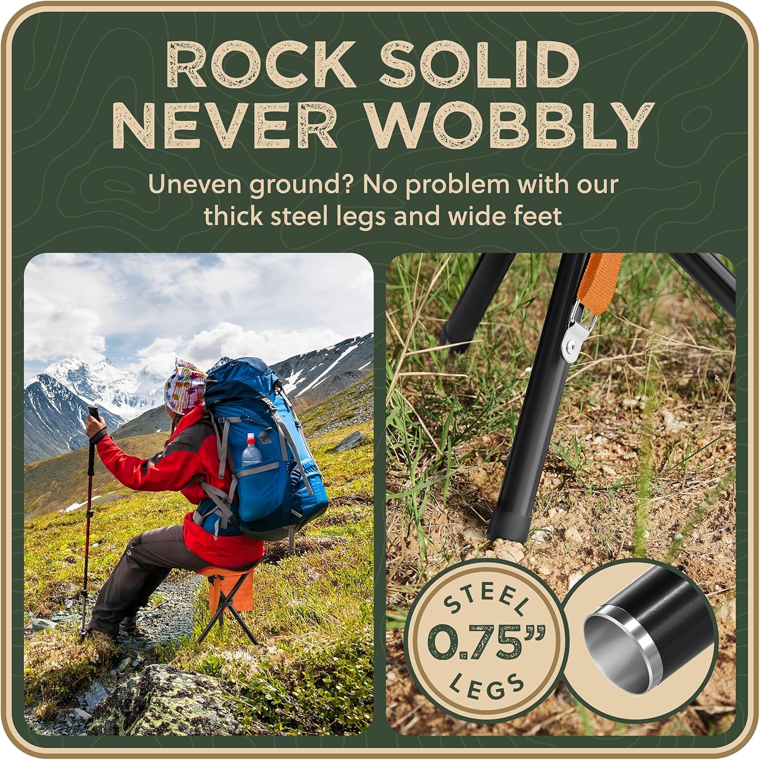 - β ROCK-STEADY: Unwavering stability on uneven terrains on the tripod chairs folding lightweight stool due to the thick 0.75β steel legs and large non-skid feet. Enjoy a secure, comfortable hunting stools portable seat, on a muddy trail or a sandy beach