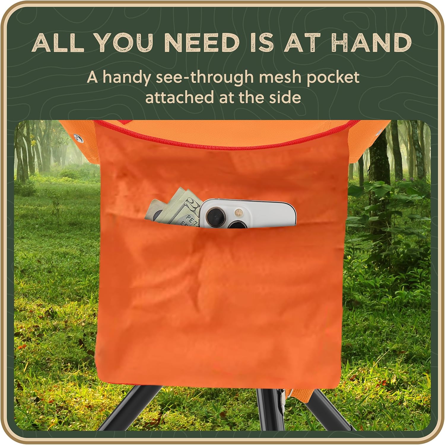 - β HANDY MESH STORAGE: Featuring a breathable mesh pocket, the small hunting chair allows for easy access to your essentials like snacks, gadgets, or small tools, keeping them secure by the folding hunting chair without the bulk of larger pockets