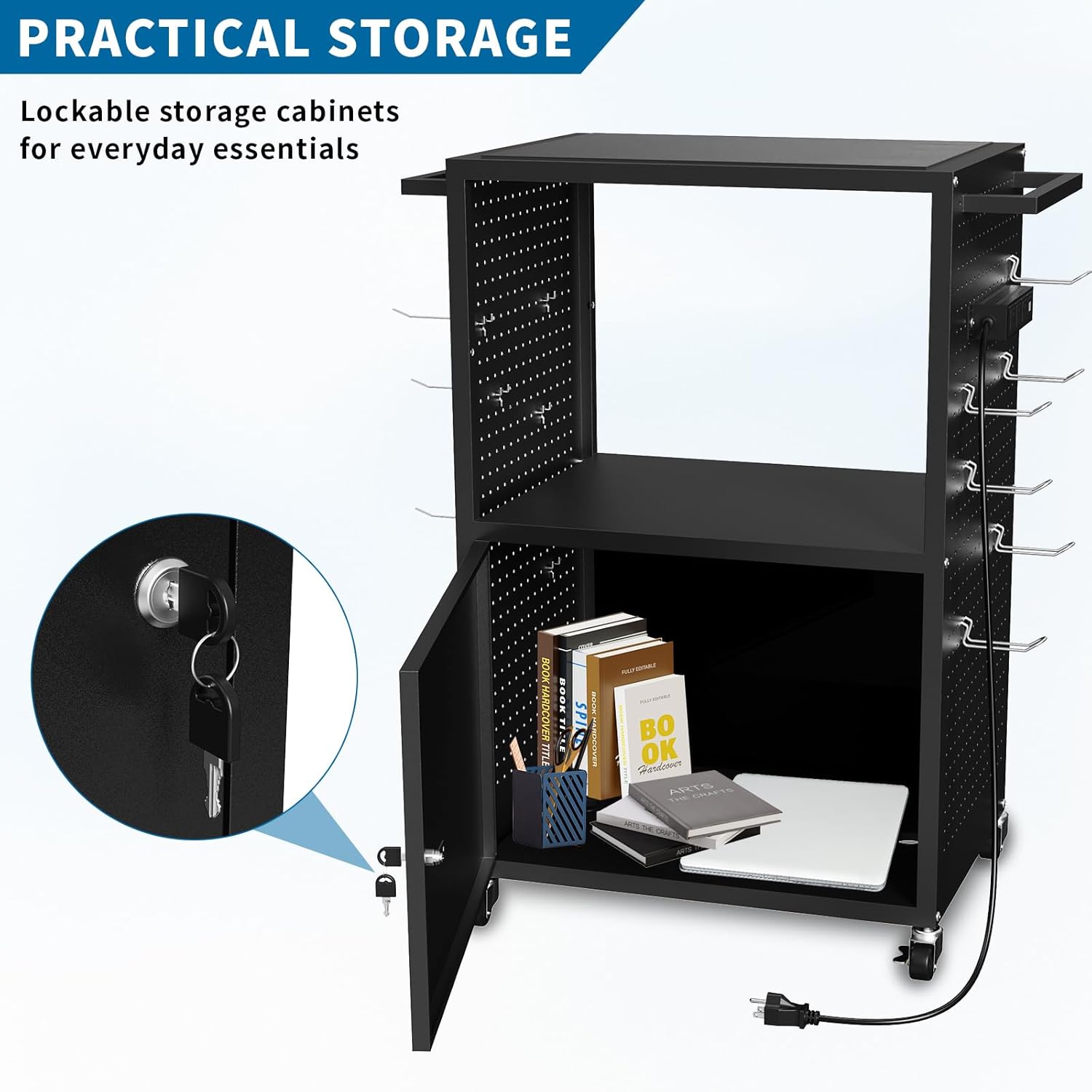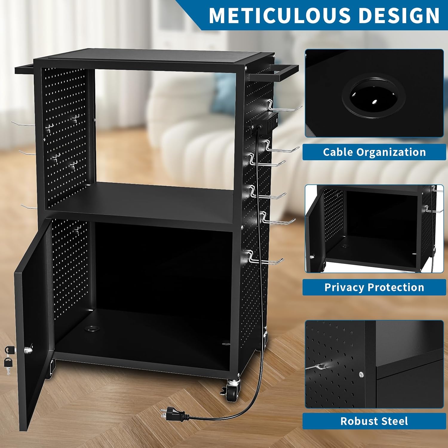 - Built-In Power Strip for Convenient Access: A side power strip offers easy access to outlets, making it effortless to connect power tools, laptops, and other electronic devices. This mobile computer cart boosts productivity by keeping devices powered and ready to go.