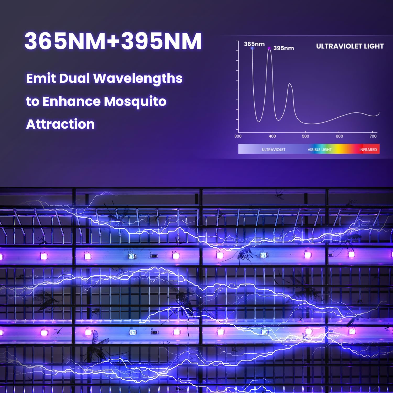 - Efficient Bug Zapper Indoor with 2 Wavelengths: Dual-spectrum UV LEDs (365nm+395nm) mimic human body heat signatures to lure 2X more mosquitoes and bugs than single-wavelength mosquito zappers.