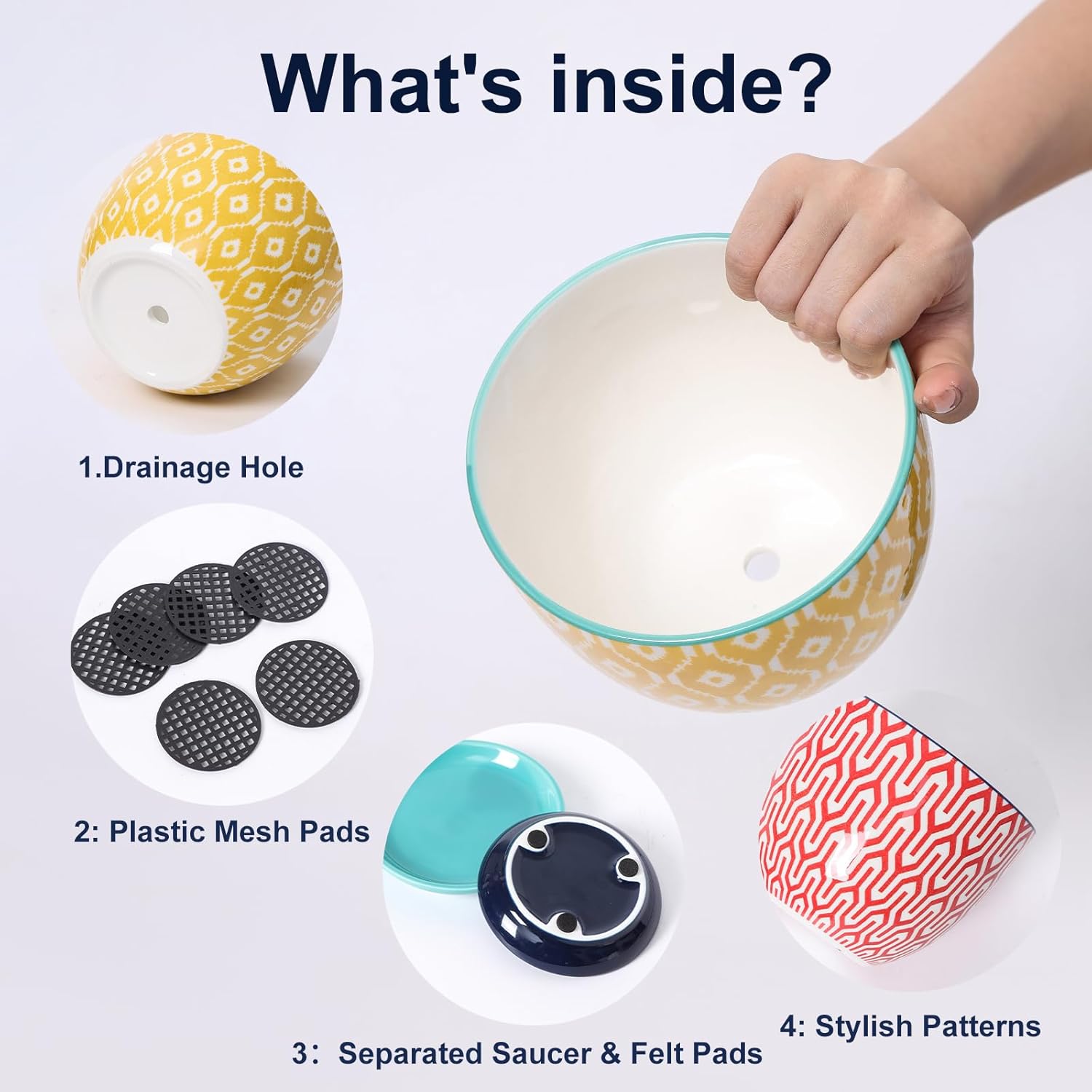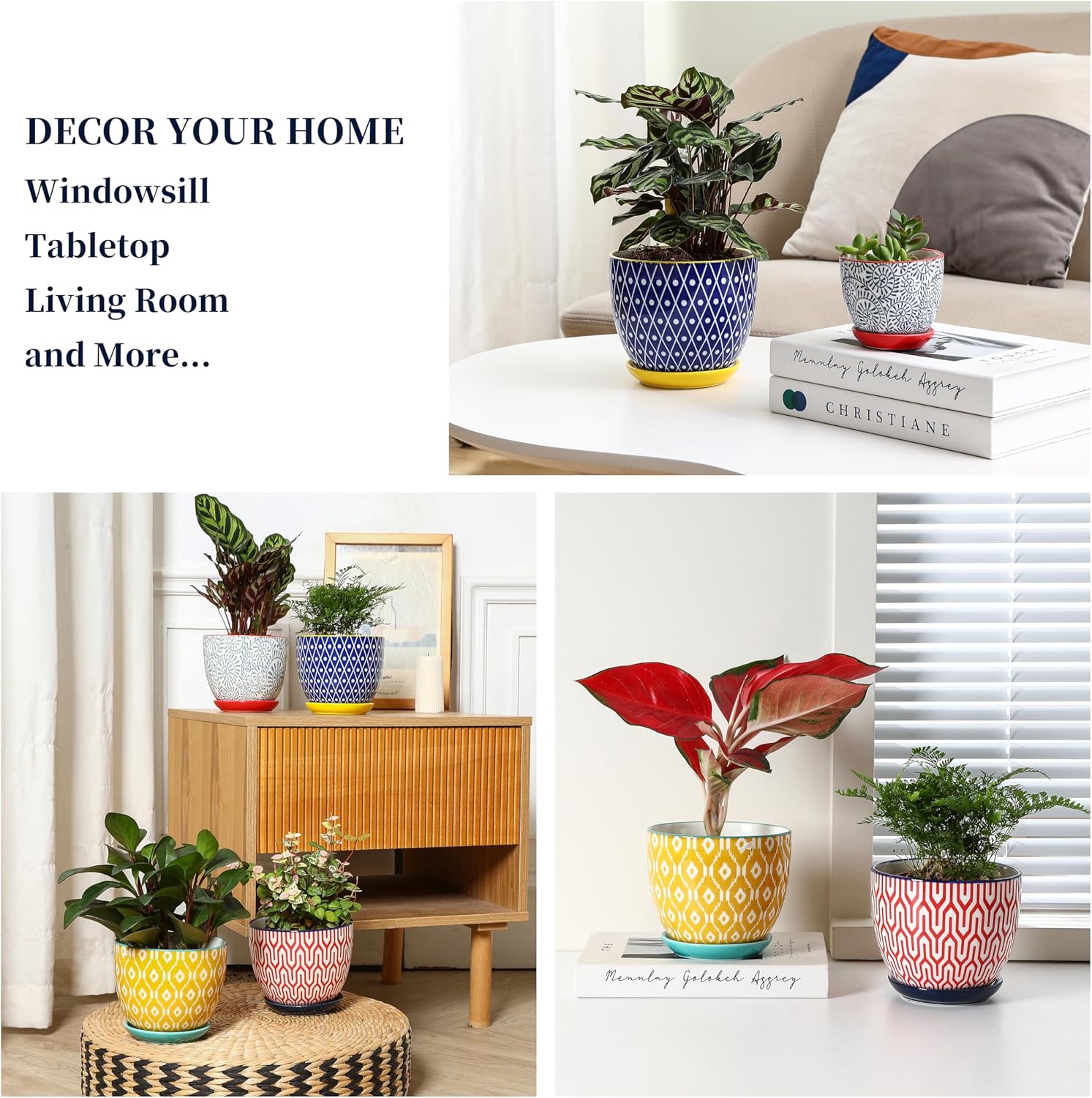 Selamica Ceramic Plant Pots, 5.6 Inch Flower Pots for Indoor Plants, Planters with Drainage Hole and Saucer, Garden Pots for Succulent, Orchid, Home Decor, Set of 4, Assorted Colors