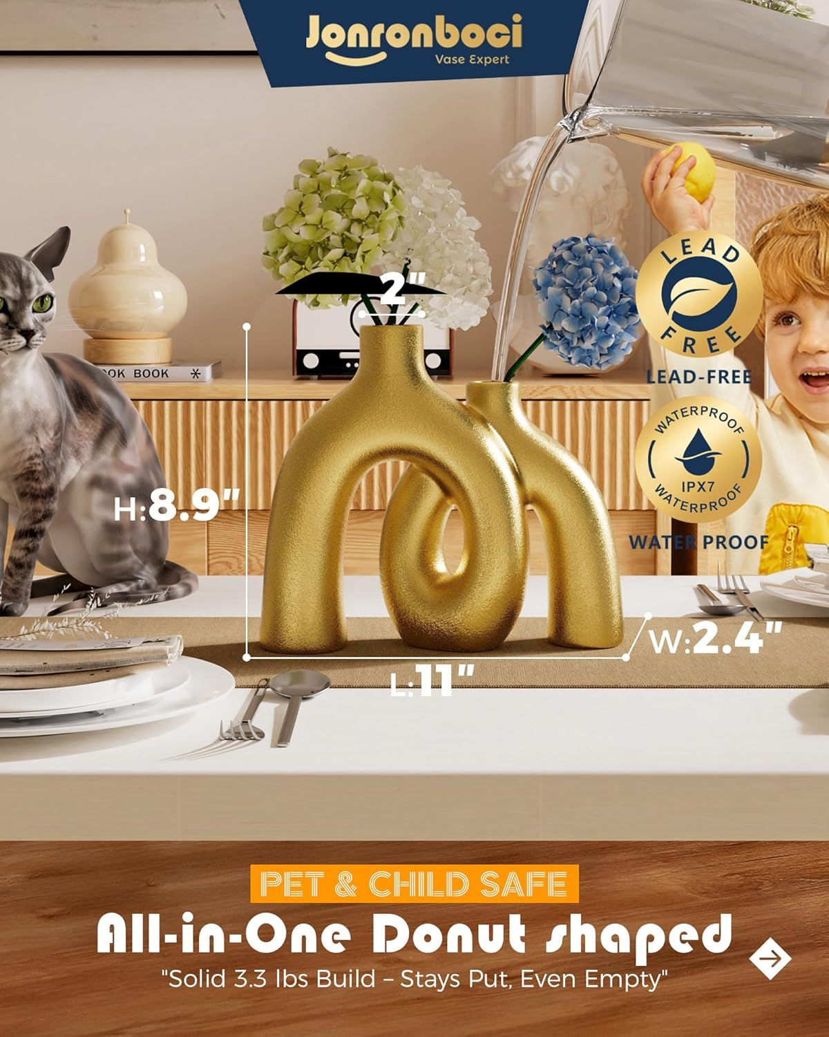 - Size - This set includes one matte golden handmade vases. Conjoined Size W 10" X , H Small: 7.3" and Large 8.9", with a vase neck of 1.5". Both vases feature a modern classic transitional style.