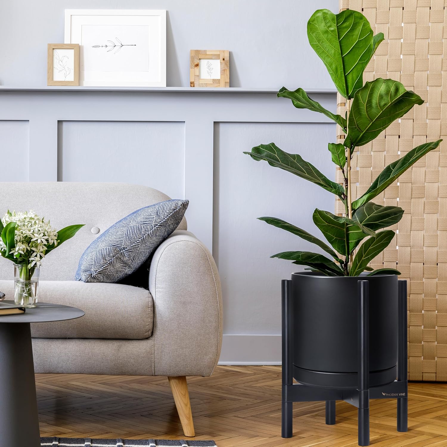 D'vine Dev Ceramic Planter with Ebony Stand - 12 Inch Modern Round Flower Pot with Wood Planter Holder, Black, 55-B-H-2