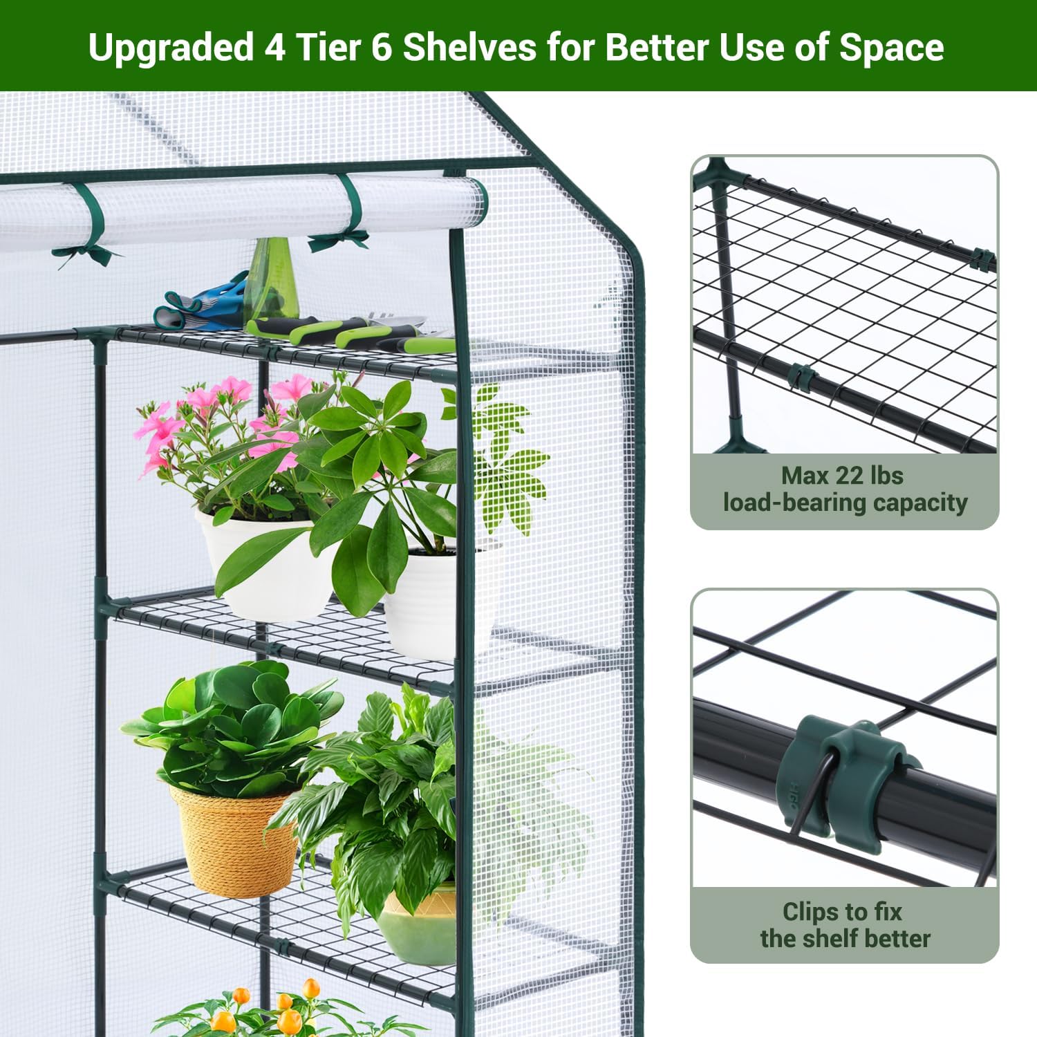- Upgraded 4-Tier 6-Shelf Design: With dimensions of 4.8x2.5x6.4 FT, the Ohuhu portable greenhouse provides ample space for your seed trays, flower pots, and other planting needs. Each rack comes with secure clips to fasten them to the sturdy metal frame, preventing any overturning accidents