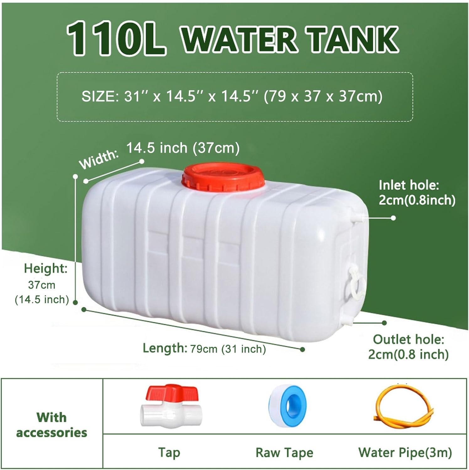 - 【LARGE CAPACITY】:6 sizes: 25L/6.6Gallon, 35L/9Gallon, 50L/13.2gallon, 80L/21gallon, 110L/29gallon, 200L/53gallon, It can meet the different needs of outdoor long-distance traveling, irrigation, and household water needs. Comes with faucet, tape and 3m length pipe.