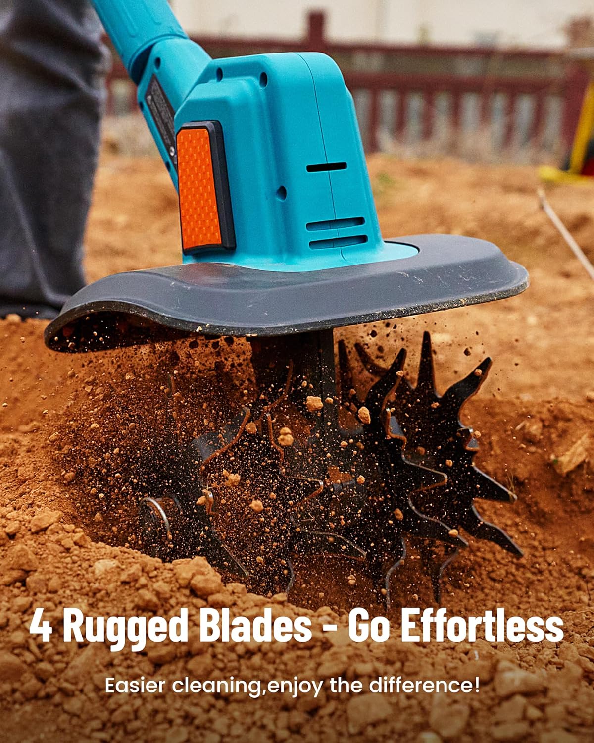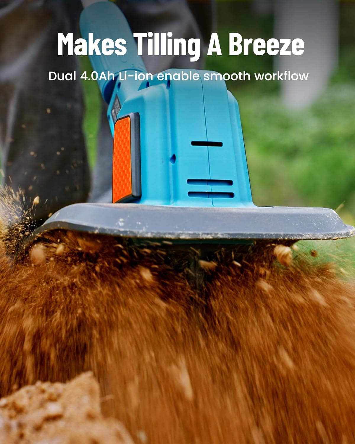 - Battery Powered Garden Tiller: Dual Battery Advantage - The inclusion of two 4.0Ah batteries doubles your tilling runtime, providing extended operation on a single charge. Whether you're cultivating hard, compacted soil or working through softer terrain, you'll experience seamless power delivery from start to finish