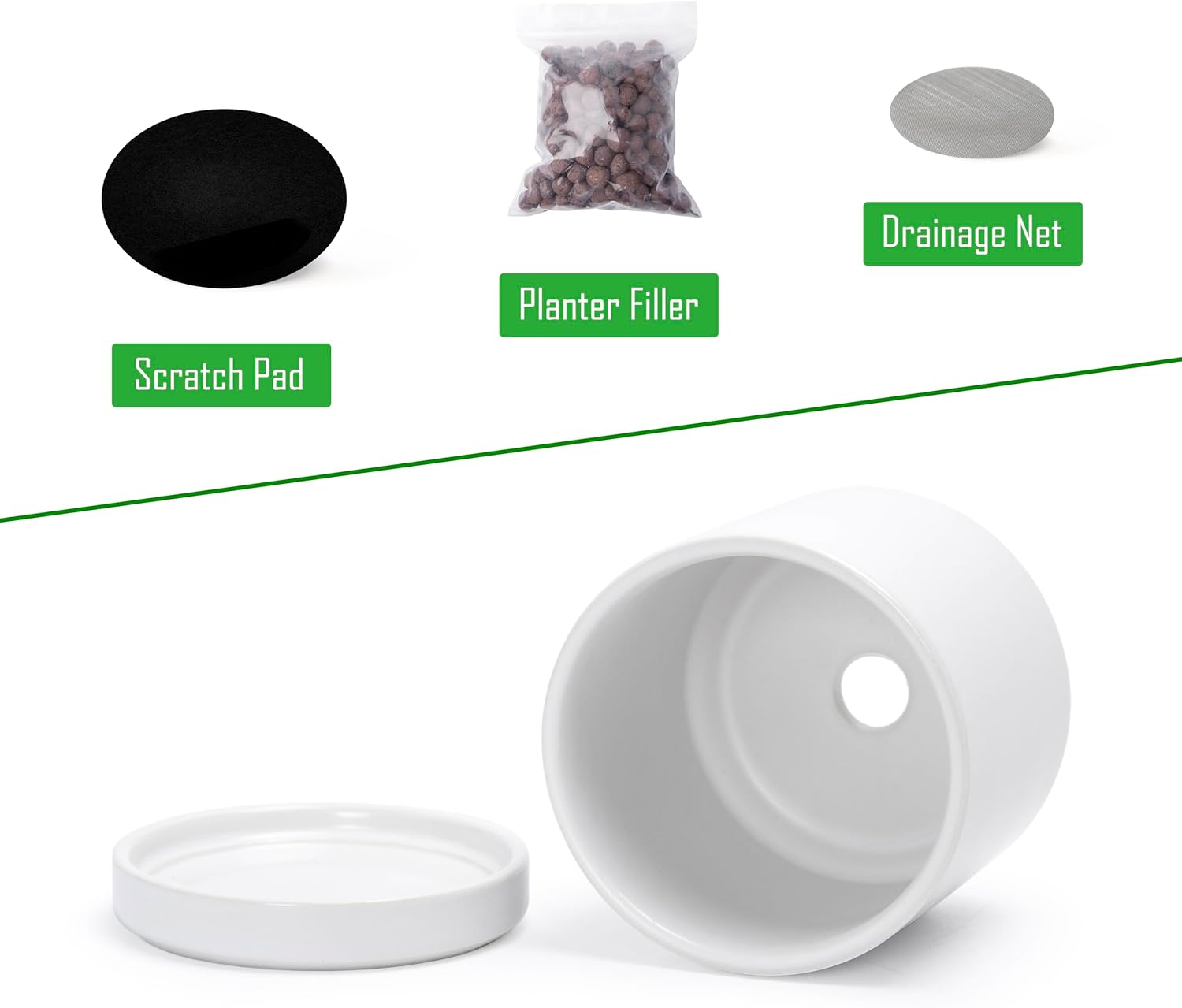 - Planter pot with drainage hole, mesh drainage net and protective scratch pad included.