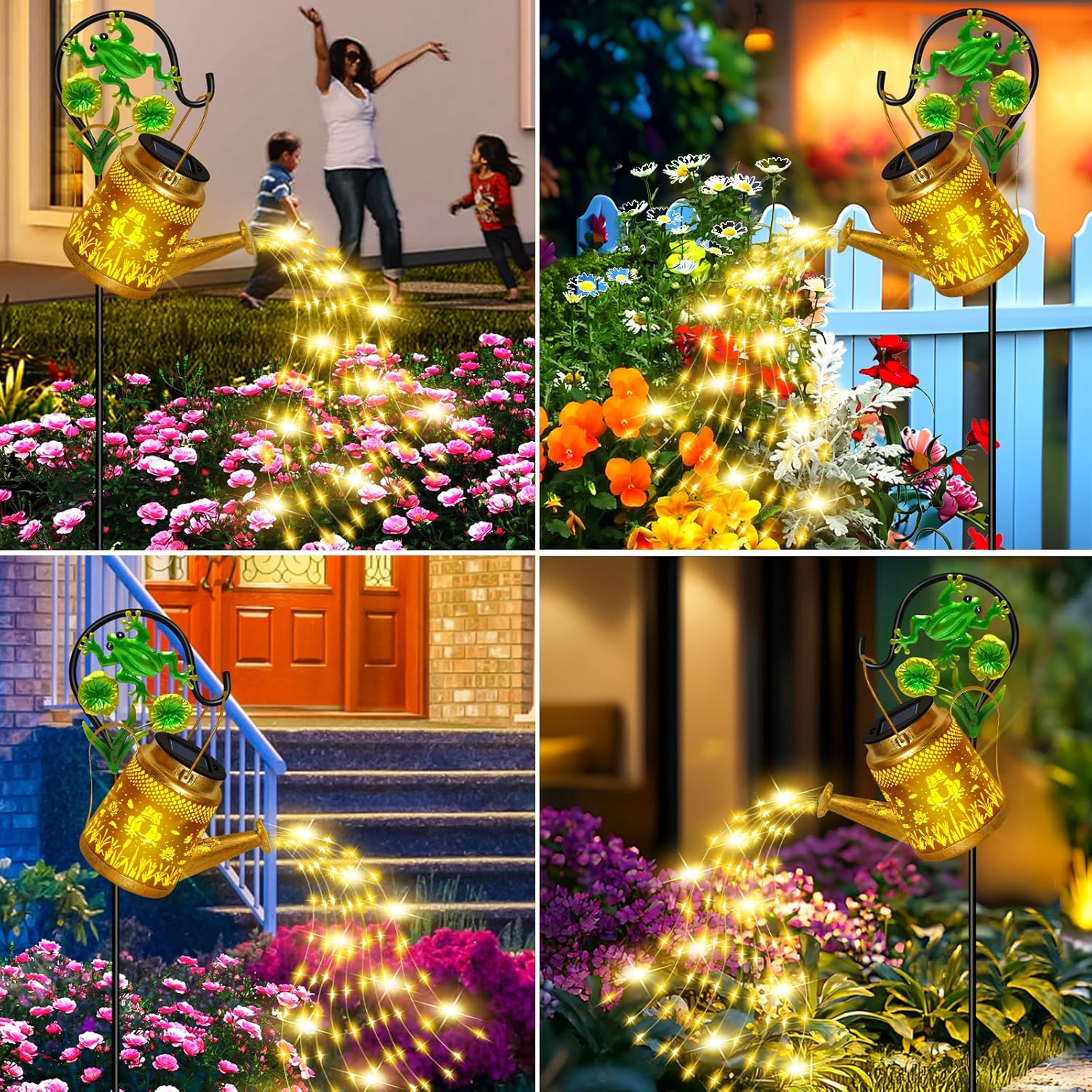 - 【Frog Watering Can & Shepherd Hook】This Frog-inspired watering can light is equipped with 80 bright LED lights, distributed across ten 31.1-inch strands to create a mesmerizing cascading glow, hollow-out design casts Frog patterns onto your garden,. Paired with a sturdy shepherd hook, it is easy to install while ensuring stability in the ground