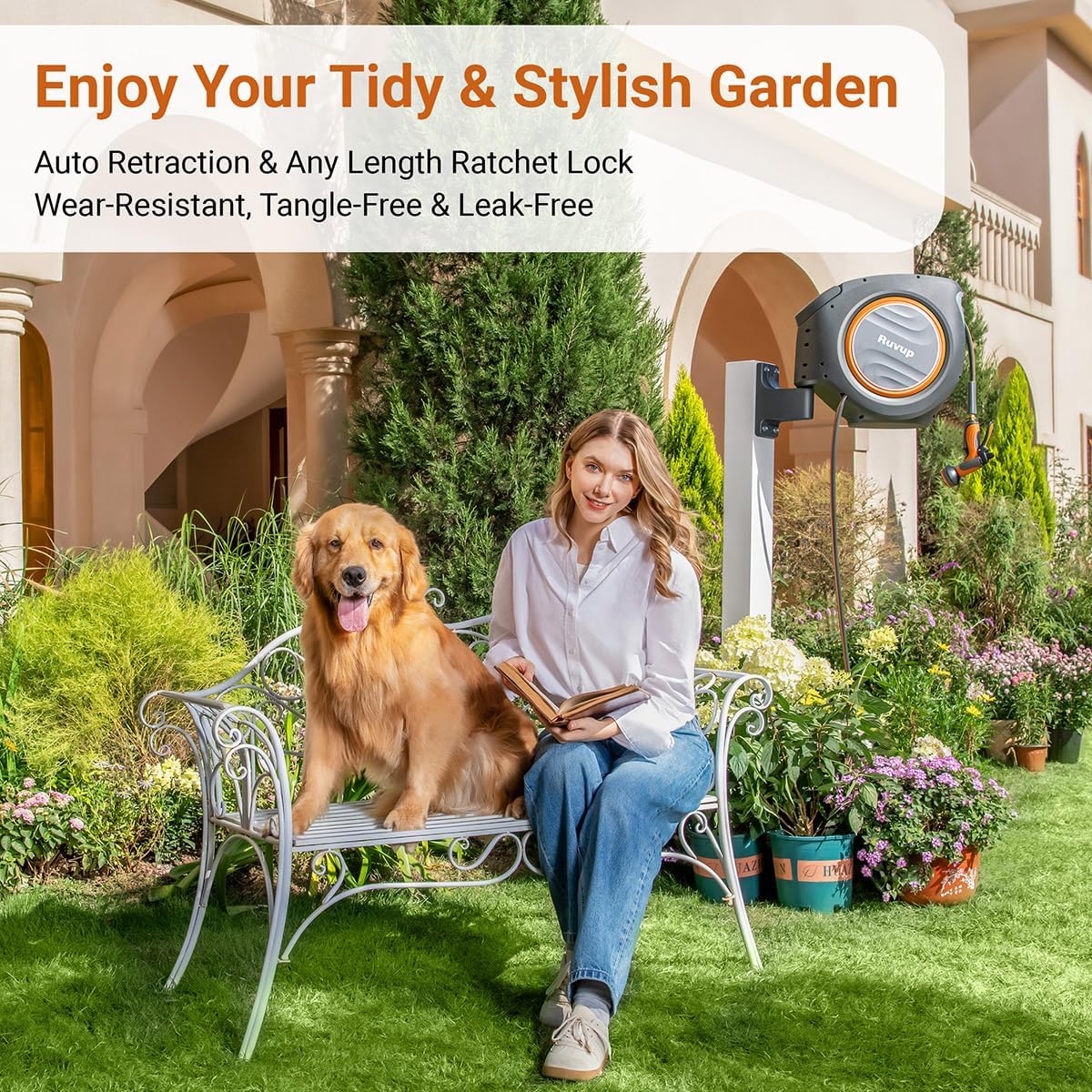 - Convenient, Tidy and Stylish: Featuring a patented ratchet locking system and unique automatic hose retractable technology, the Ruvup garden hose winding reel smoothly retract the hose back into the casing, no jamming or overlaps. Make your gardening tasks easier with the Ruvup wall mount hose reel and enjoy your tidy and stylish yard.