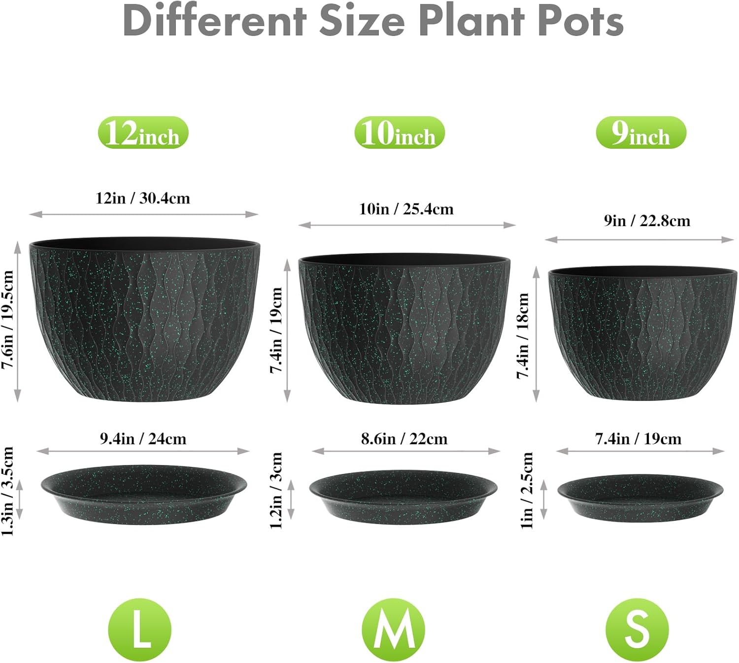12/10/9 inch Large Plant Pots, 3 Pack Wide Flower Pots for Outdoor Indoor Plants, Water Ripples Plastic Planters with Drainage Holes and Saucers for Garden Hourse, Black with Green Speckles