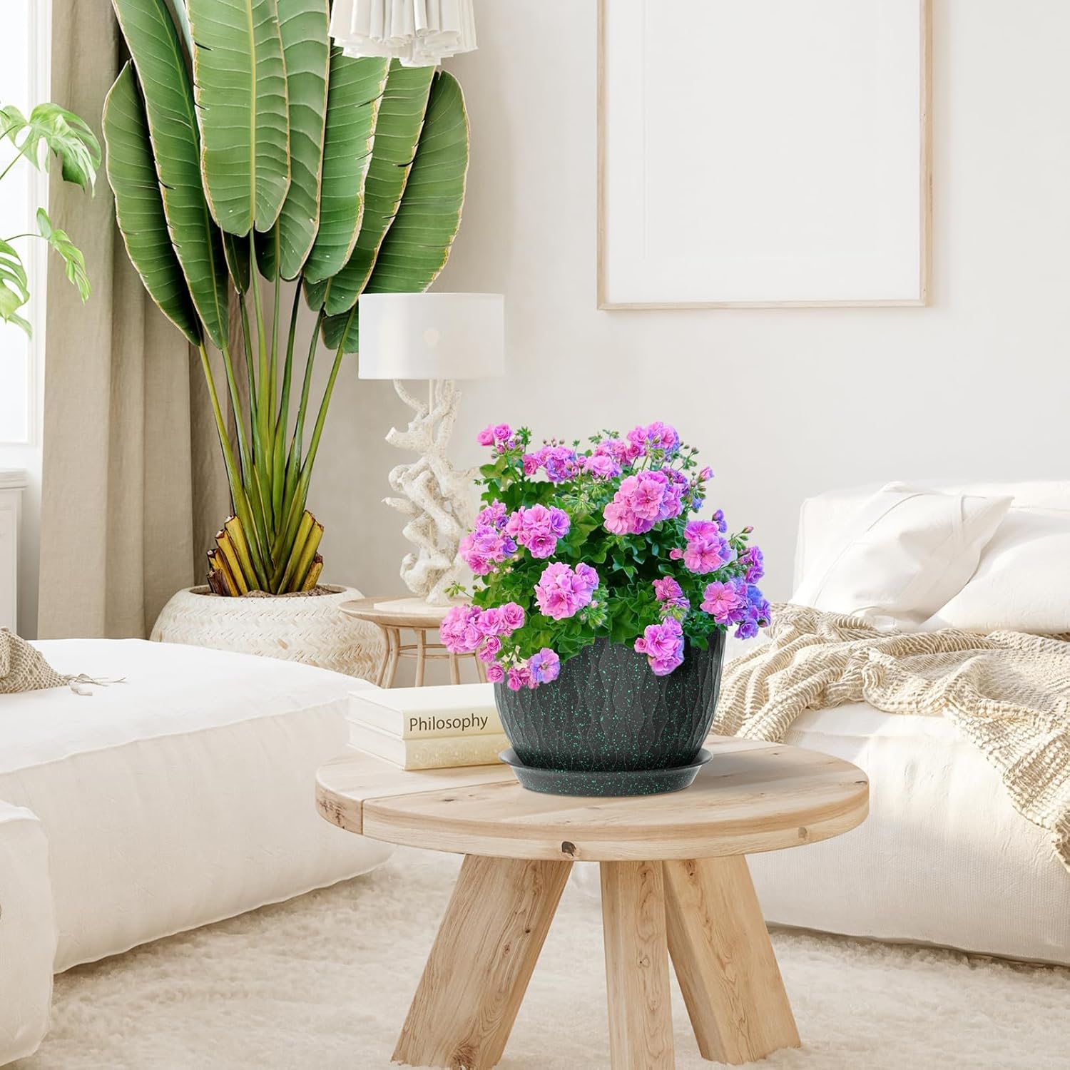 - 【Multiple Size】This plastic planter pots set includes different size pots(12", 10", and 9" diameter pots), you can grow a variety of plants or flowers at one time like succulents, cactus, herbs, ZZ plant, aloe, peace lilies, as you like, creating a beautiful dream garden for you
