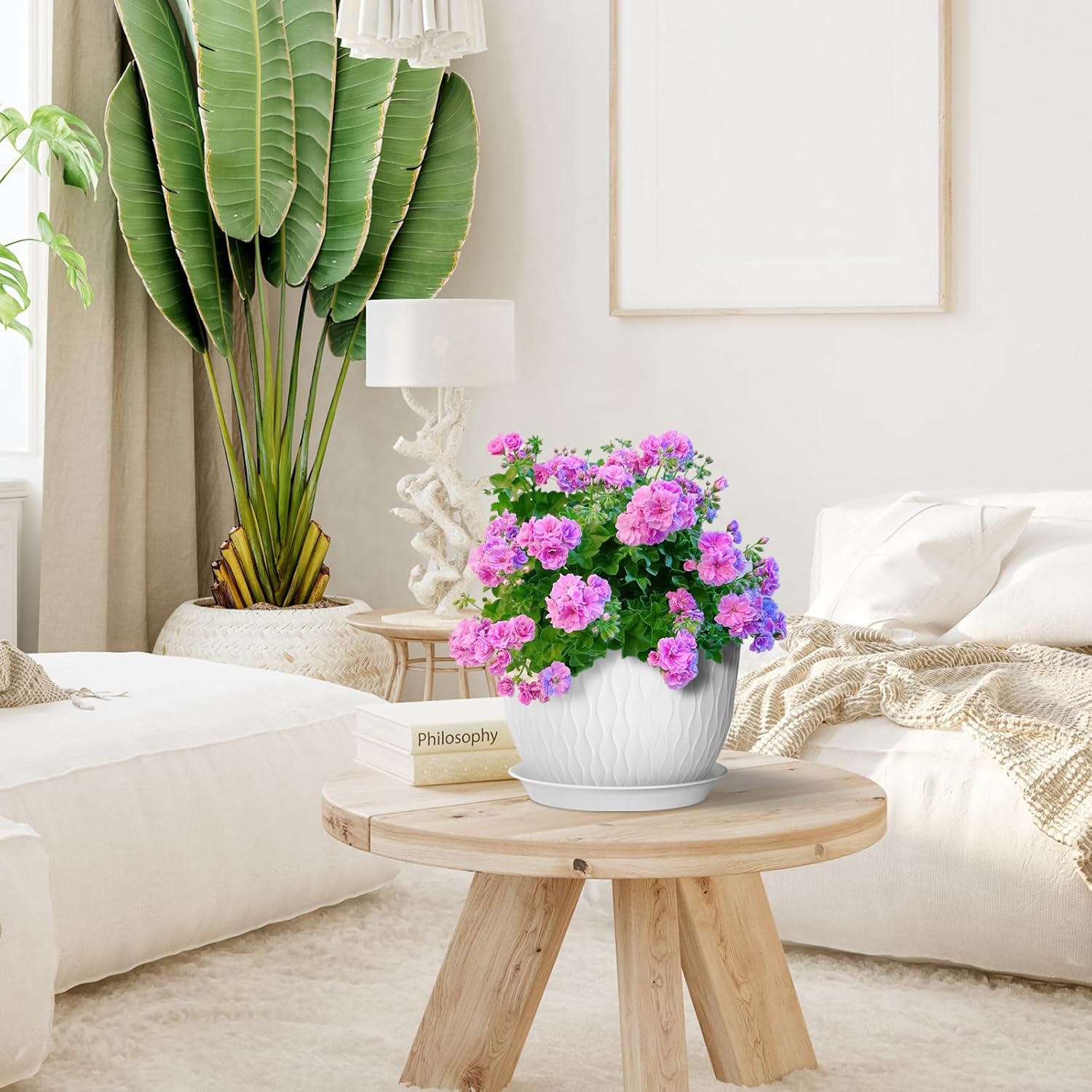 12/10/9 inch Large Plant Pots, 3 Pack Wide Flower Pots for Outdoor Indoor Plants with Water Ripples, Big Plastic Planters with Drainage Holes and Saucers for Garden House Plants, White