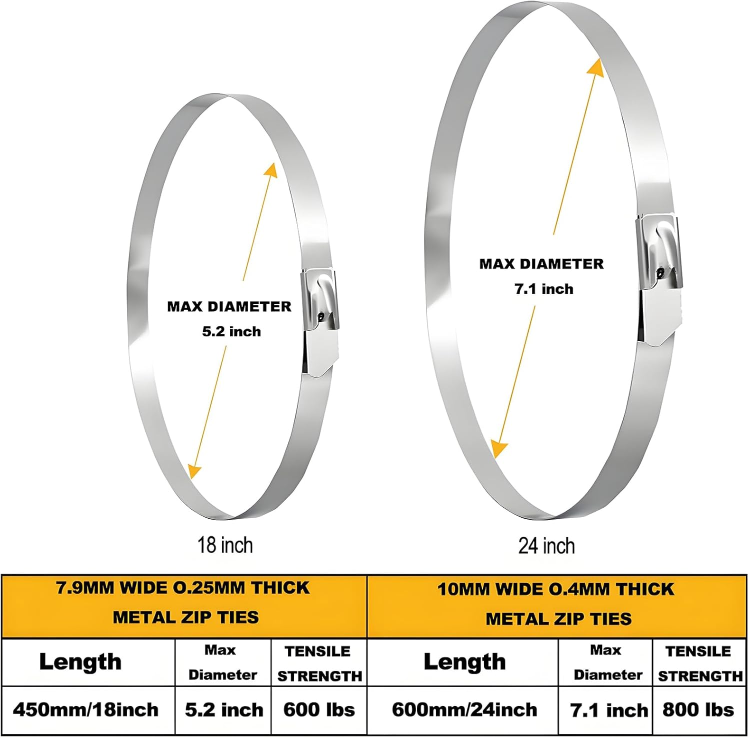- High Strength & Diverse Sizes: We offer two sizes of stainless steel zip ties heavy duty: 18 inches (80 pieces) with a tensile strength of up to 600 lbs, and 24 inches (40 pieces) with a tensile strength of up to 800 lbs. These metal zip ties are made of durable stainless steel, ideal for outdoor heavy-duty applications, providing reliable solutions for wire mesh, fence gates, barbed wire fences, chain link fence privacy screens, and chicken wire rolls
