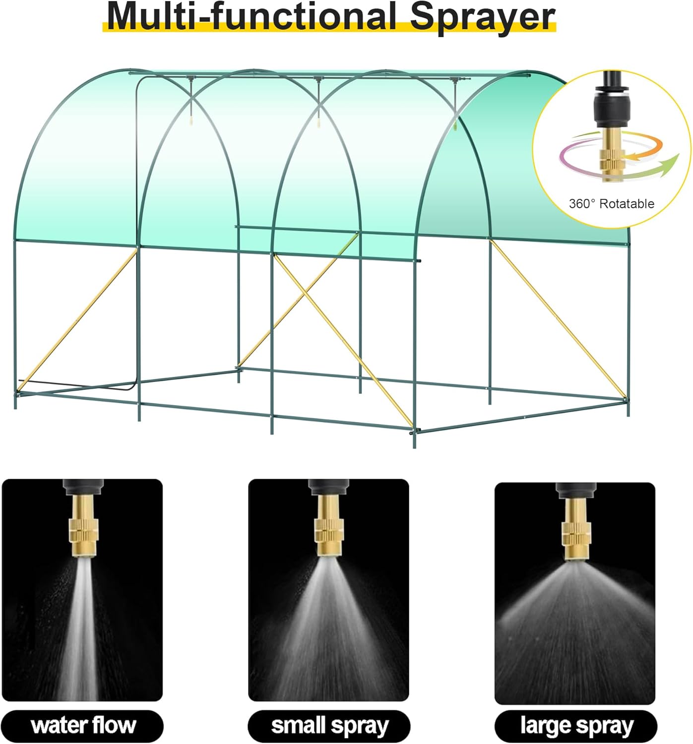 - Greenhouse With Watering System: The Walk-in tunnel greenhouse for outdoors with sprinkler can take care of all the plants in 360Β°, which saves more water and time than ordinary garden greenhouses, and it can also be used to control the temperature and humidity inside the greenhouse to ensure that the plants have the best growing environment