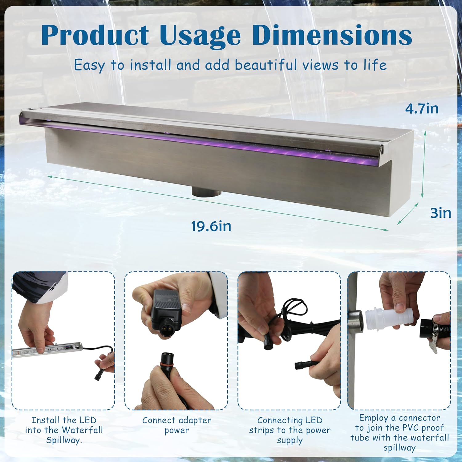 19.6 Inch Pool Waterfall Spillway, Stainless Steel Pond Waterfalls with Multi Color-LED Light Outdoor Pool Fountain, Water Flow Fountains Kit for Garden Patio & Rockery Decoration