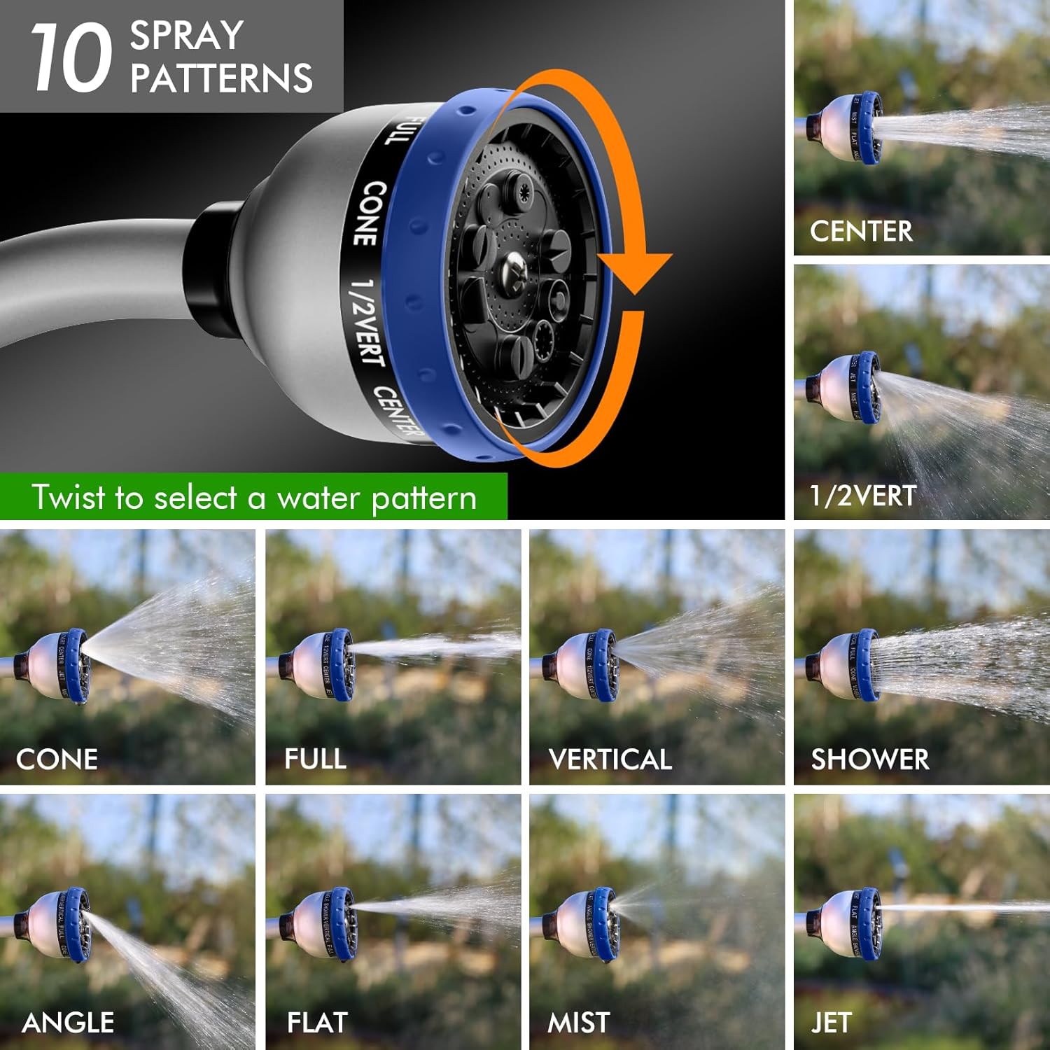 - 【10 Watering Patterns】Rotate the spray head dial to select a water pattern from Shower, Flat, Full, Mist, Jet, Center, Cone, Angle, Vertical, and ½ Vertical. Whether you need the high-pressure jet to clean your window, the useful angle to wash your car, the gentle shower to clean your shrubs, or the soft mist to water your hanging baskets, the 10 patterns have you all covered.