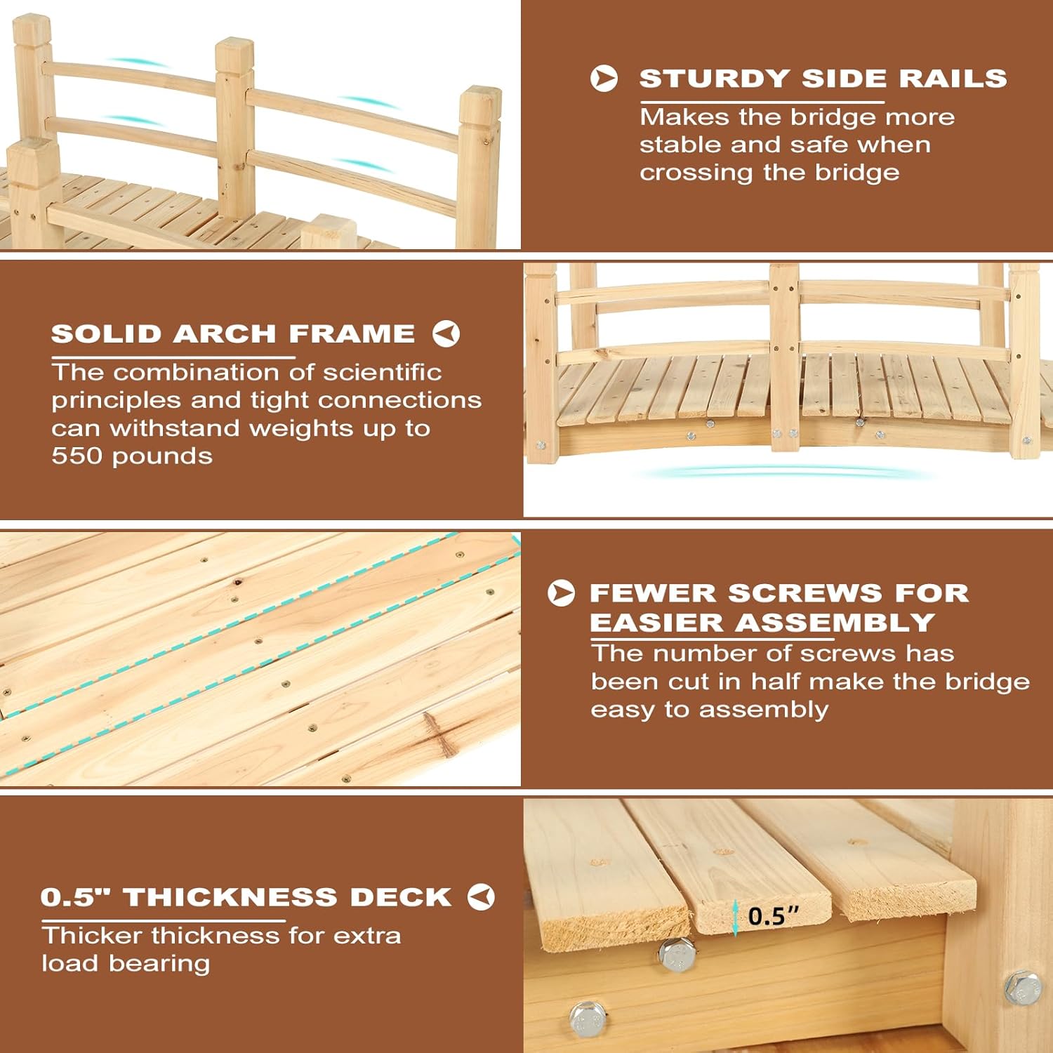 - 【Solid Bridge Walkway & Double Railings】Our wooden garden bridge is reinforced with solid arched frames and 3 wooden posts. The 26.3" width walkway is strong enough to hold up to 550 pounds. It's easy for your family or pets to walk across this bridge. Besides, the double safety rails not only add to the visual appeal but also enhance safety by preventing accidental falls. The bottom of the bridge is reinforced with 3 extra planks and sturdy screws to improve overall safety and stability.
