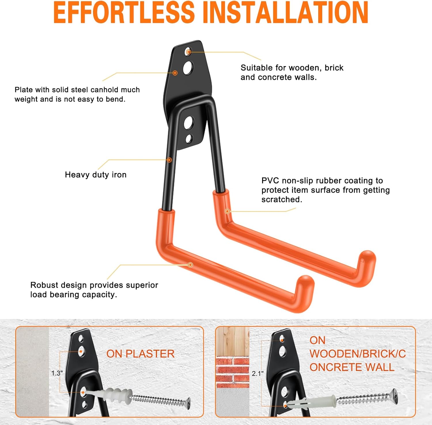 - Widely Applicable: These wall hooks save space and maximize your storage. They are versatile and reusable for items such as ladders, hoses, garden tools, power tools, bicycles, shovels, brooms, scooters, weeders, and bulk items.