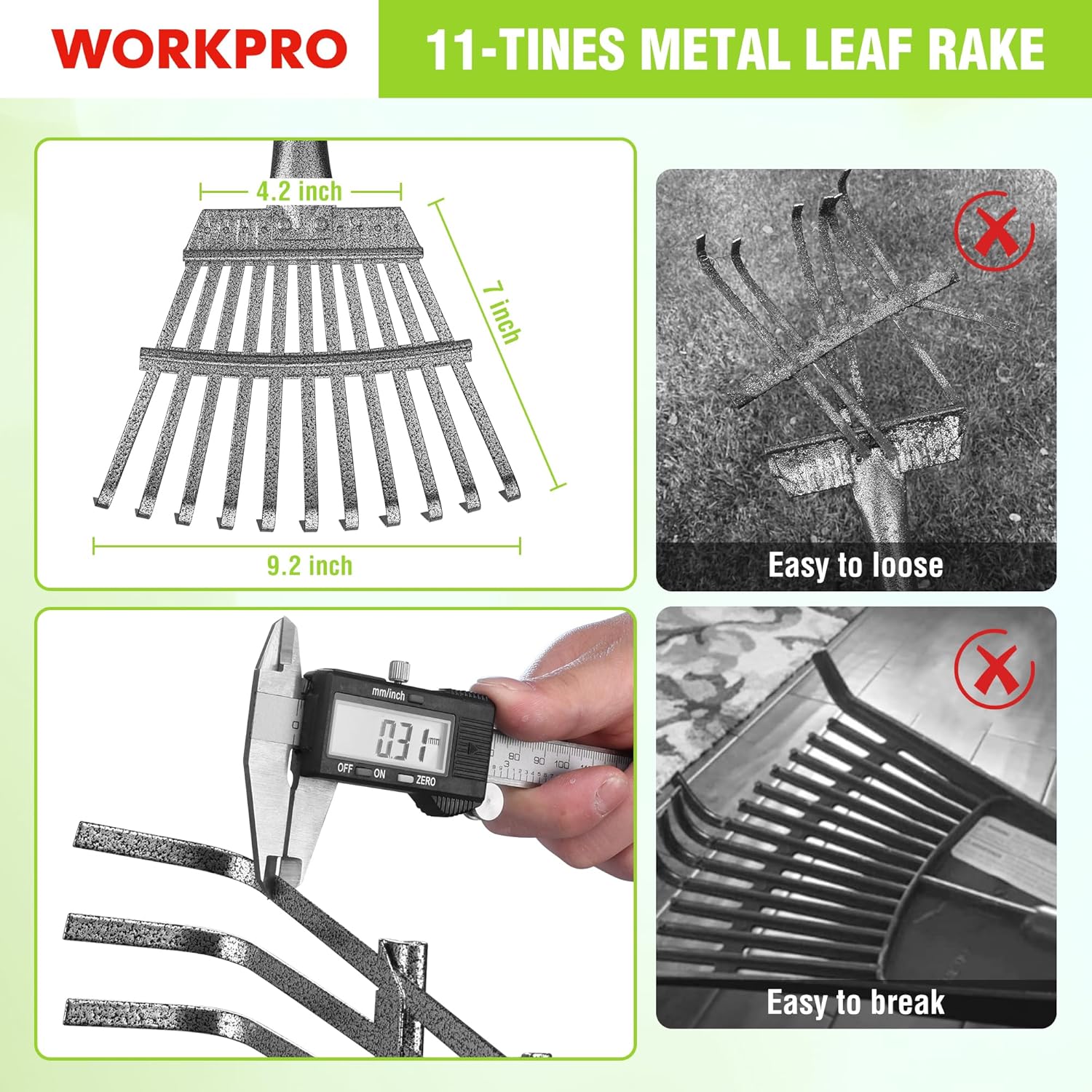 WORKPRO Rake, Small Rake for Leaves with 72” Adjustable Long Handle, 11 Steel Tines, Heavy Duty Metal Leaf Rakes for Garden, Lawn, Yard, Shrub, Flower Bed, Narrow Rakes 9" Wide Head for Tight Spaces