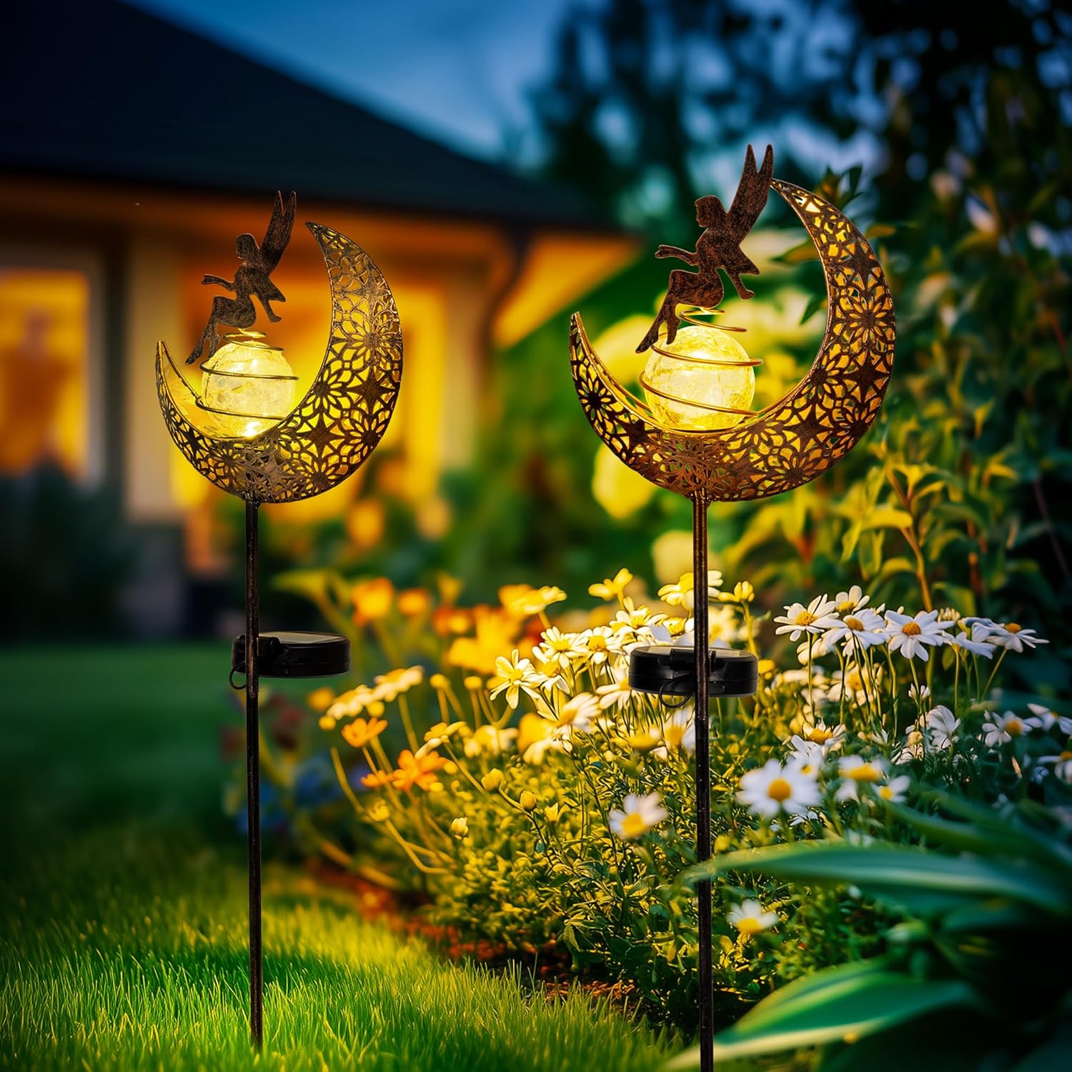 Fairy Garden Solar Lights Outdoor Moon Stakes, Waterproof Outdoor Metal Decor Gifts for Women Mom, Art Moon Sculpture for Yard, Patio, Garden, Porch, 2 Pack