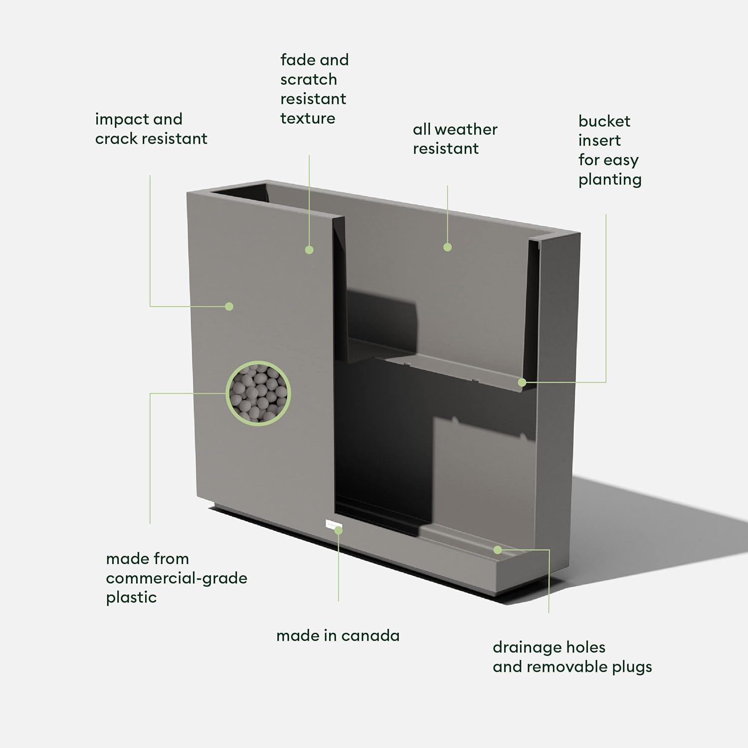 - DIMENSIONS & DETAILS: This double-walled planter’s exterior dimensions measure 30” in Height, 10” in Width, 38” in Length. With the removeable insert bucket installed, the interior dimensions measure 12.85” in Height, 7” in Width, 35” in Length. It comes fully assembled for easy use