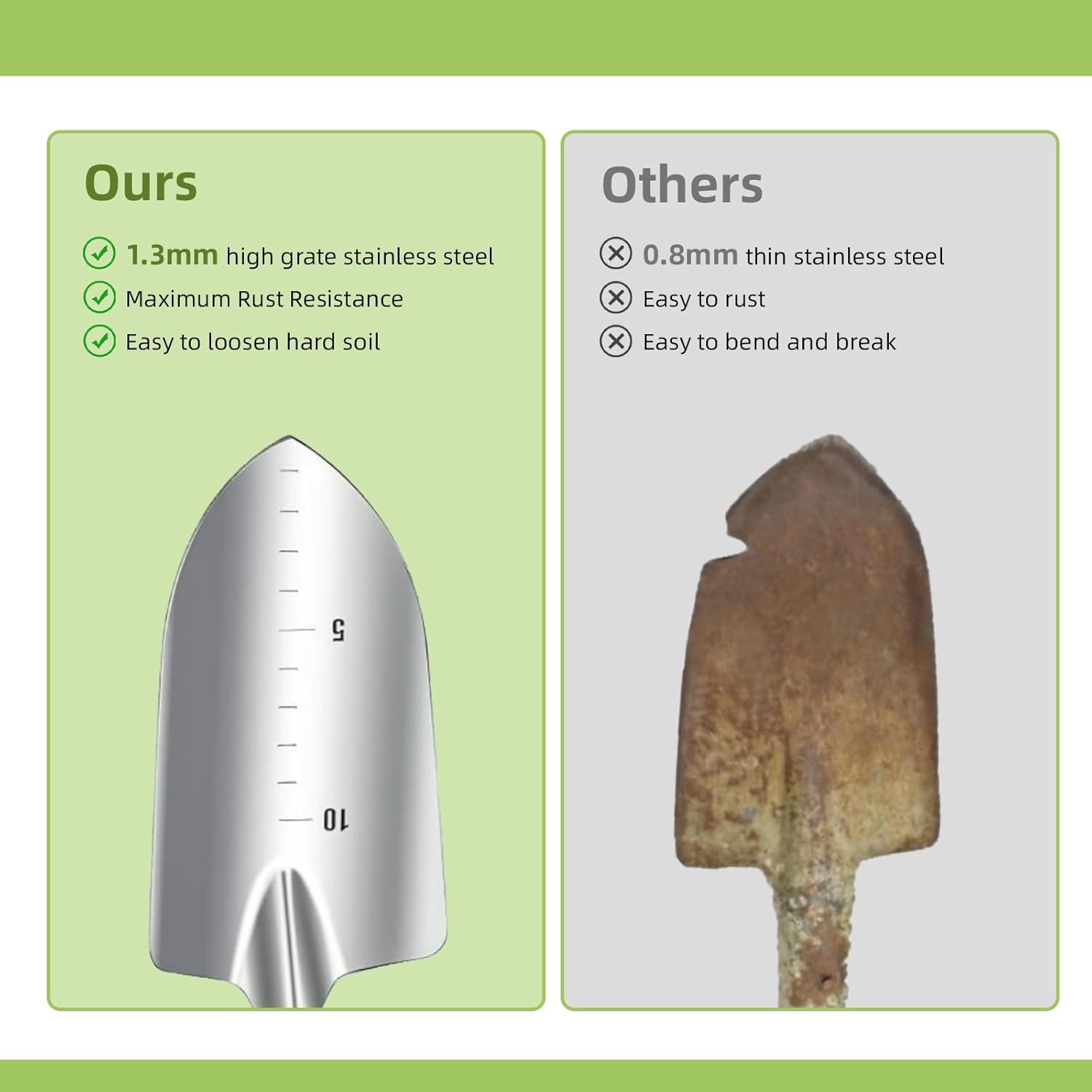 - Premium Garden Set: These gardening tools are made of high-strength stainless steel, guaranteeing corrosion resistance and rustproof for incredibly tough, sharp, and sturdy that will last a long time.