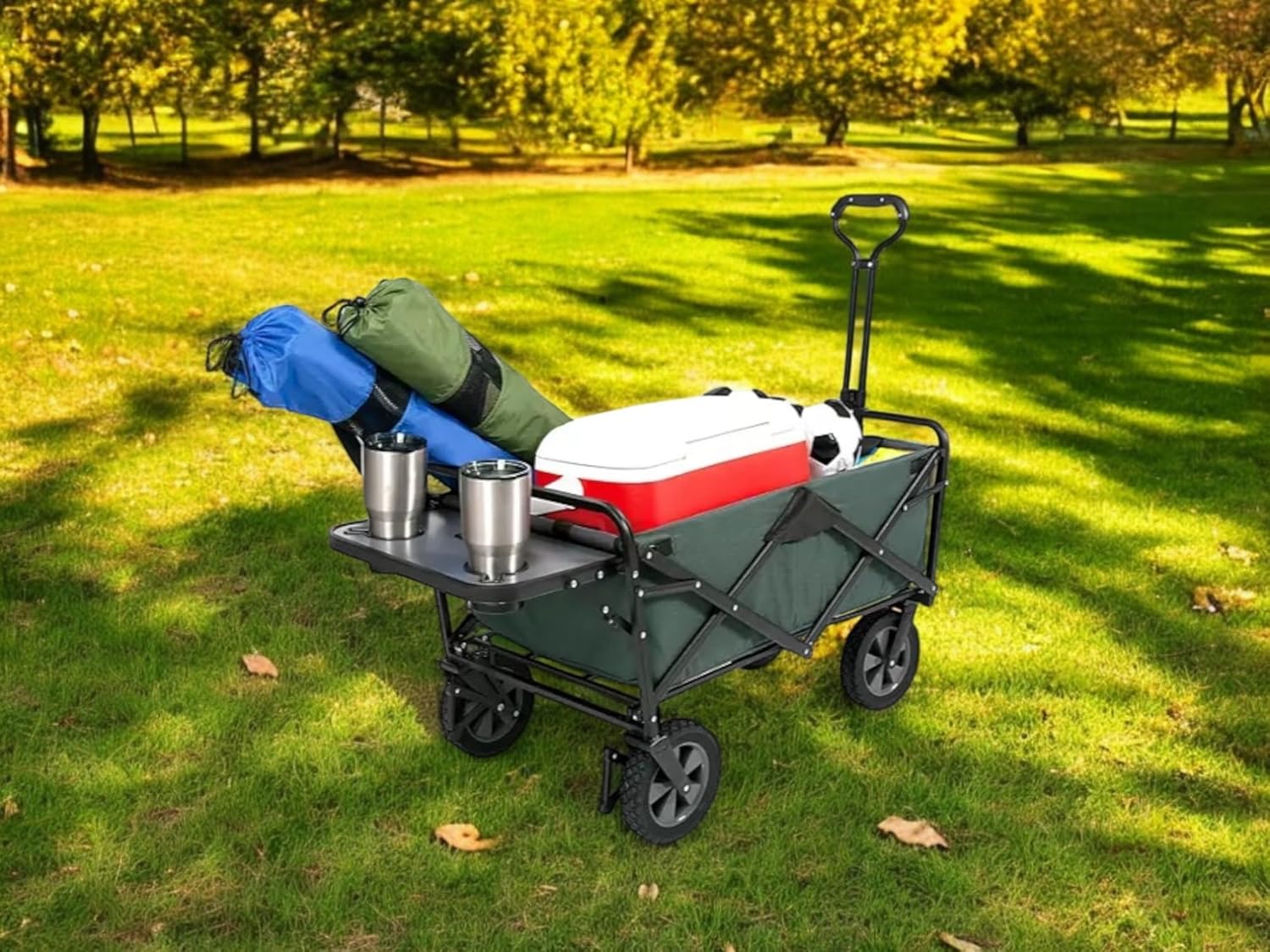 Heavy Duty Steel Frame Collapsible Folding Wagon with Table,150 Pound Capacity Outdoor Camping Garden Utility Wagon Yard Cart (Green, 1PACK)