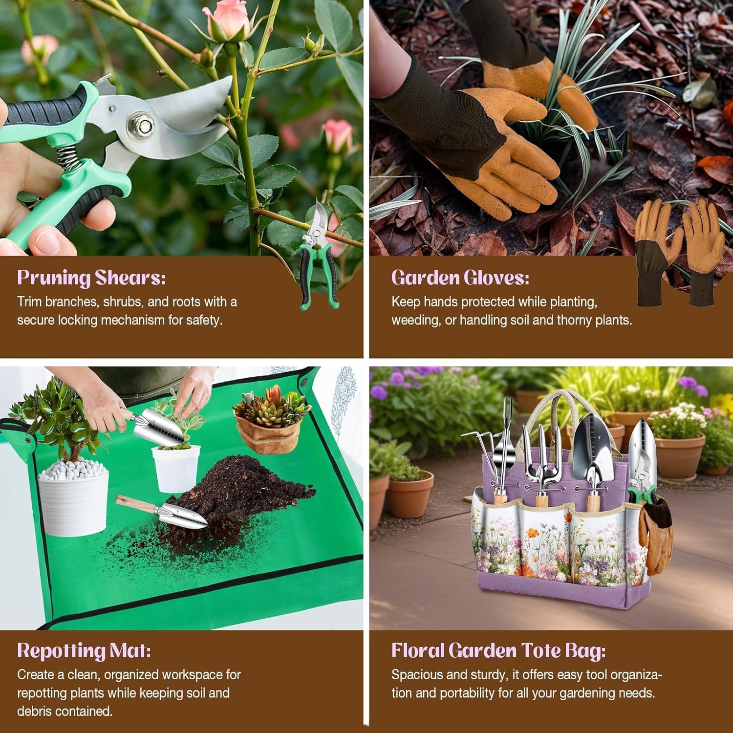- 【All-in-One Garden Tool Set & Gardening Gifts for Women】halilus gardening tool set includes a total of 8 gardening hand tools and 1 floral tote storage bag. Pruning Shears, Shovel, Hand rake, Weeder, Cultivator, Transplanter, Gardening Gloves, Repotting Mat, nearly everything you need in daily garden maintenance. High quality, enough durable to cut through thick weeds. Making it a thoughtful gift for wife, mom, daughter, grandma, neighbors and women who love gardening.