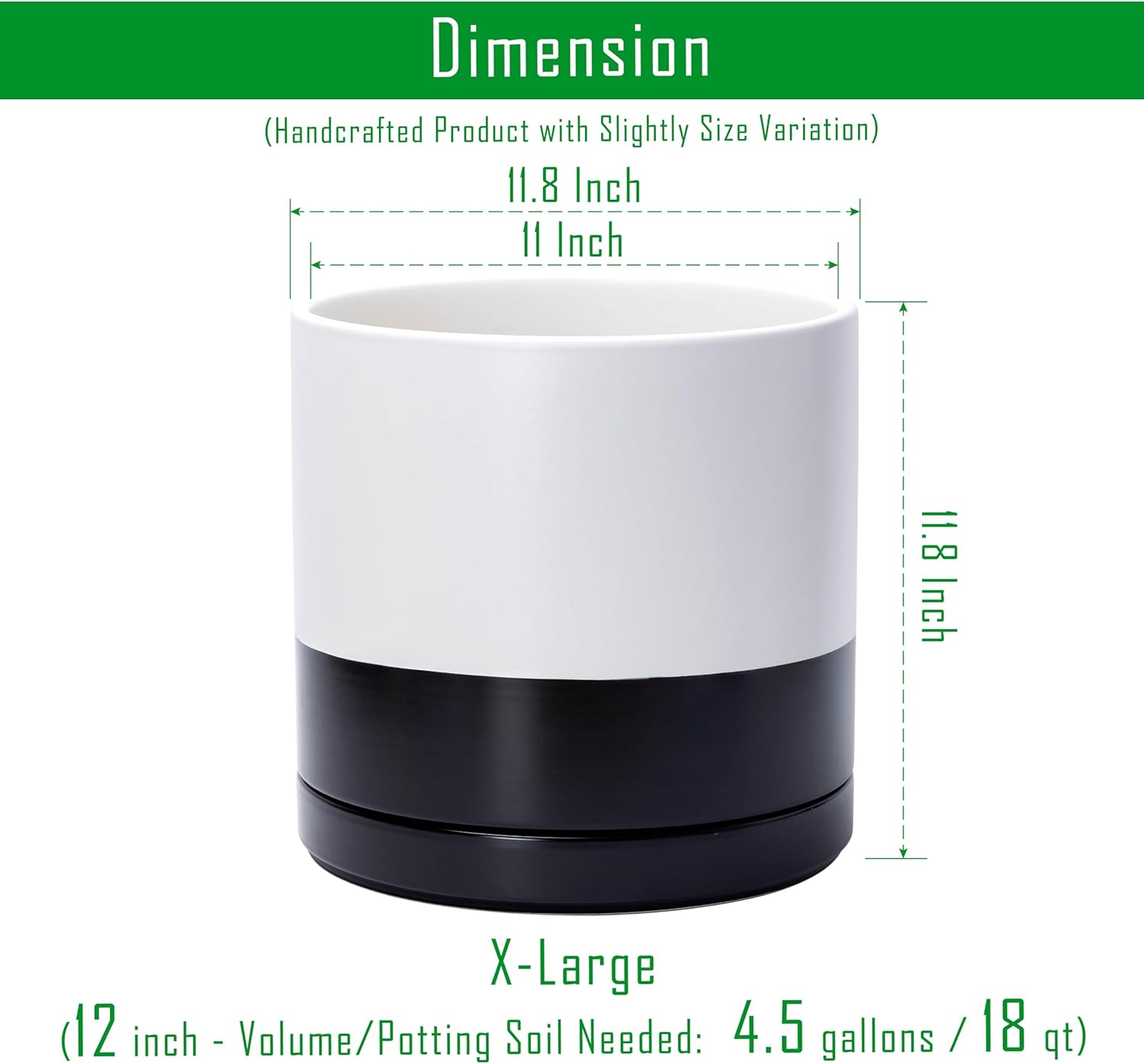 - Multiple Size Options: Available in six sizes (3.5" to 11.8") to fit plants of all types, from small succulents to larger houseplants. X-Large 12 Inch Planter Pot: 11.8" Diameter x 11.8" H, Potting Soil Needed: 4.5 gallons / 17 qt.