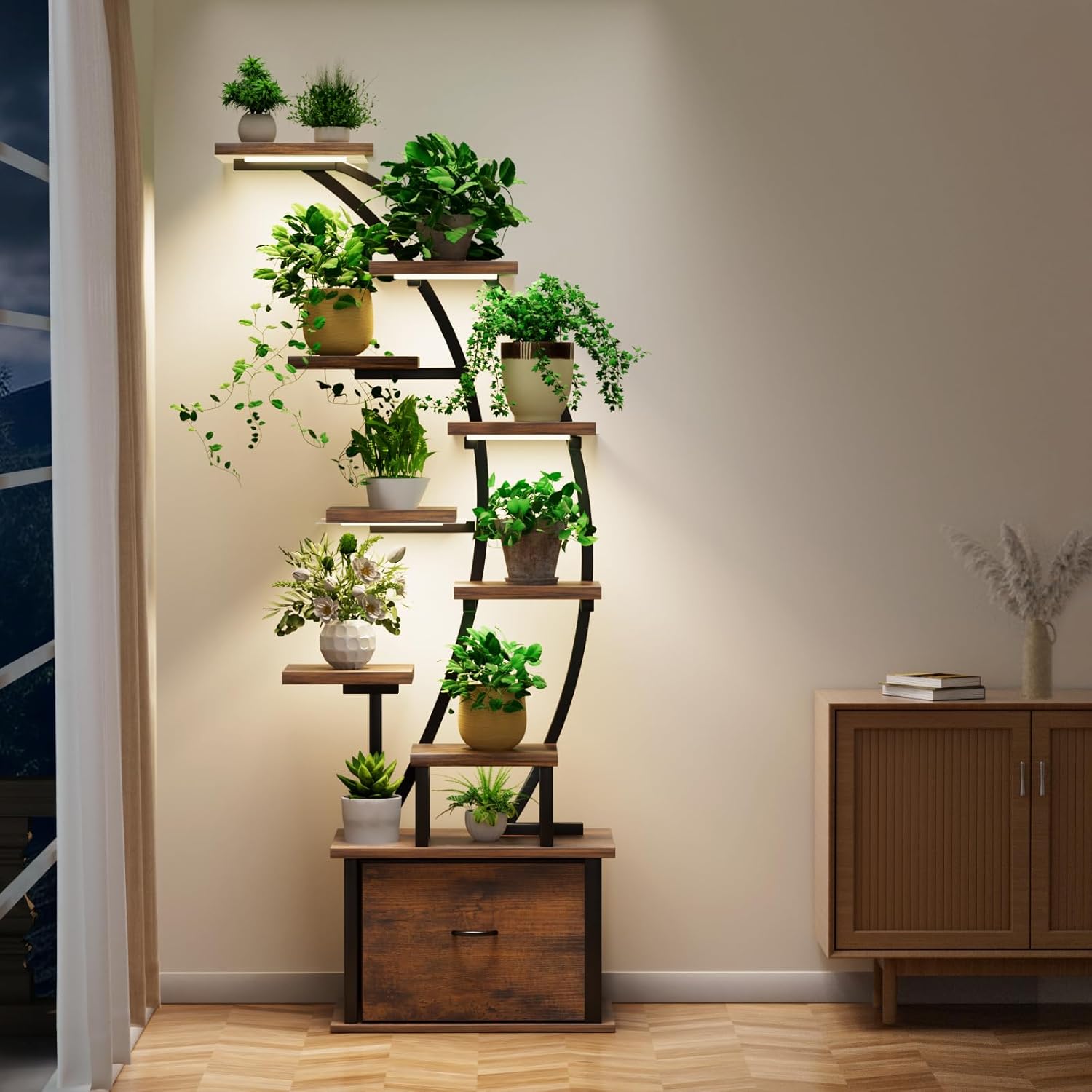 - 【10-Tier Space-Saving Design & Adjustable Base】 Maximize vertical space with this 65-inch tall plant stand, featuring 10 spacious tiers to display plants, books, or decor. Adjustable base screws stabilize the stand on uneven floors and prevent surface scratches, while the bottom storage drawer keeps gardening tools organized. Perfect for corners, balconies, or patios, its compact design optimizes small spaces with style.