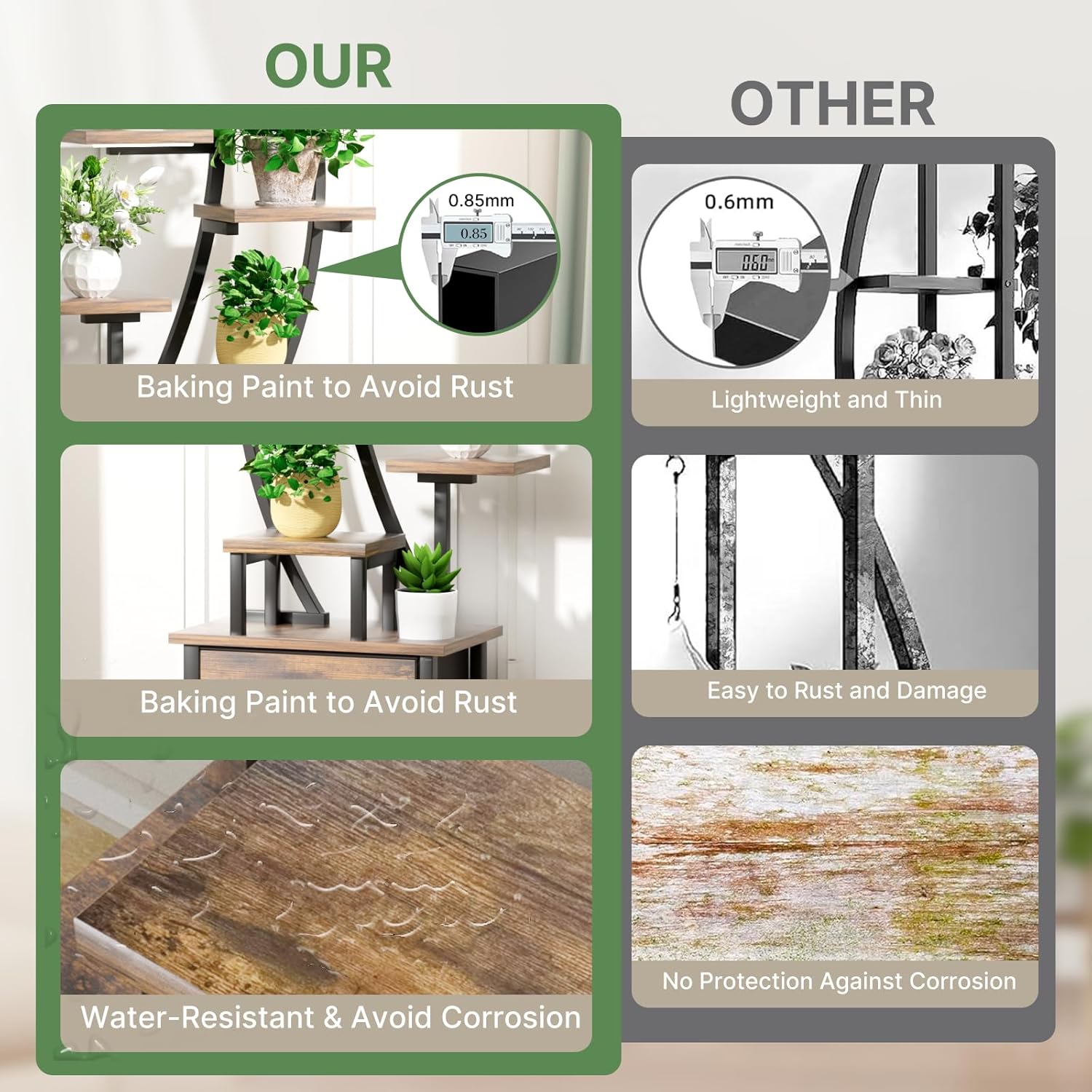 - 【Sturdy & Water-Resistant Construction】 Built with 0.85mm rust-proof iron frames and 15mm waterproof particle boards, this plant shelf withstands daily watering and heavy pots. Anti-tip straps secure it to walls for child/pet safety, while the reinforced structure ensures long-lasting durability.