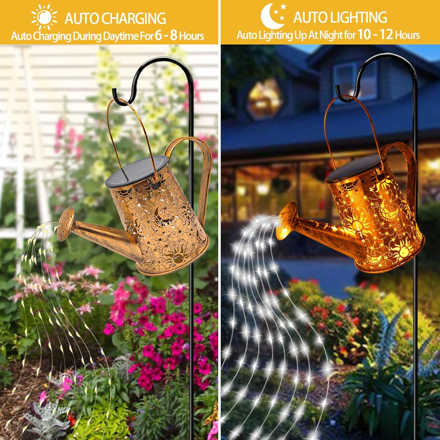 - Unique Solar Watering Can Lights with Sun&Moon Pattern - This Star Shower Garden Art is an eye-catching yard art for your home, base the popular watering can with lights pouring out design, we upgraded the solar lantern with unique sun and moon hollowed out pattern, will leave a lovely reflection pattern on the surrounding ground, make your garden outstanding