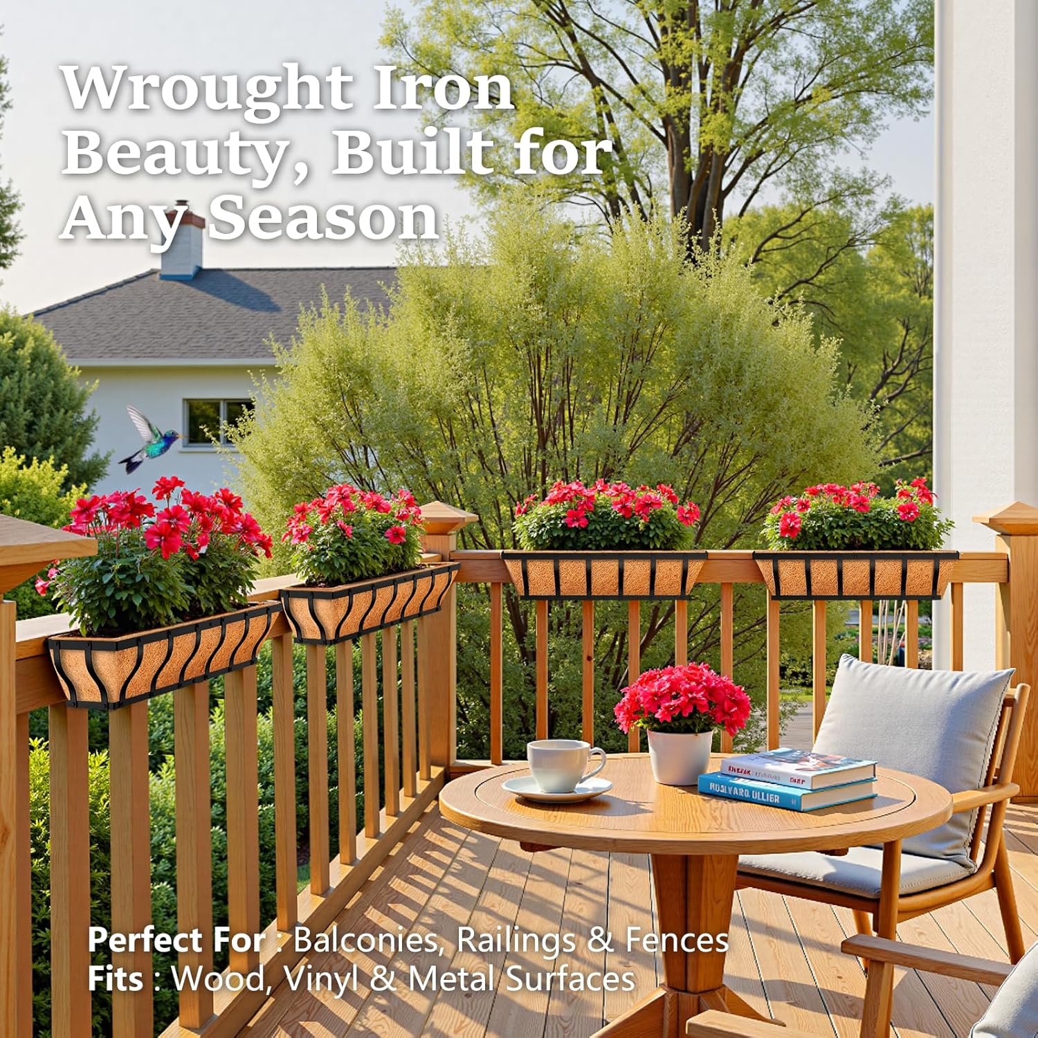 Railing Planter Boxes, Heavy Duty Window Box Planters, Adjustable Balcony Planters for Railing Hanging, with Coco Liner & Support Rod for Deck, Porch, and Patio Gardening (3 Pack, 24 Inch)