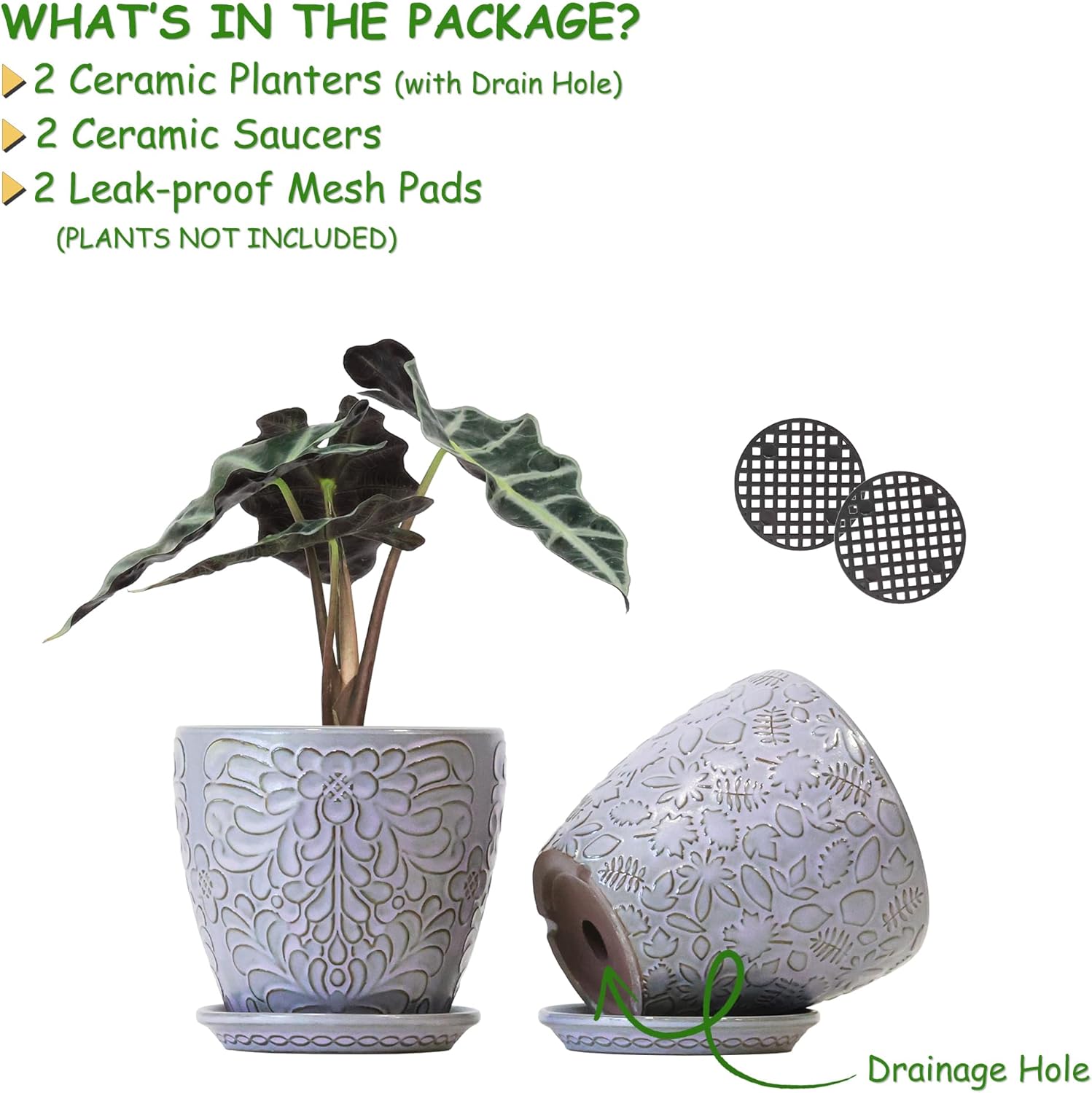 - Planters Size & Package : The indoor flower pots have a top diameter of 6"/15.5cm (fits a 5-inch inner pot), a bottom diameter of 3.74"/9.5cm, and a height of 5.7"/14.5cm. The saucers measure 4.92"/12.5cm at the top, and 3.74"/9.5cm at the bottom, with a height of 0.86"/2.2cm. The package includes 2 ceramic flower pots, 2 ceramic saucers, and 2 mesh pads (plants are not included).