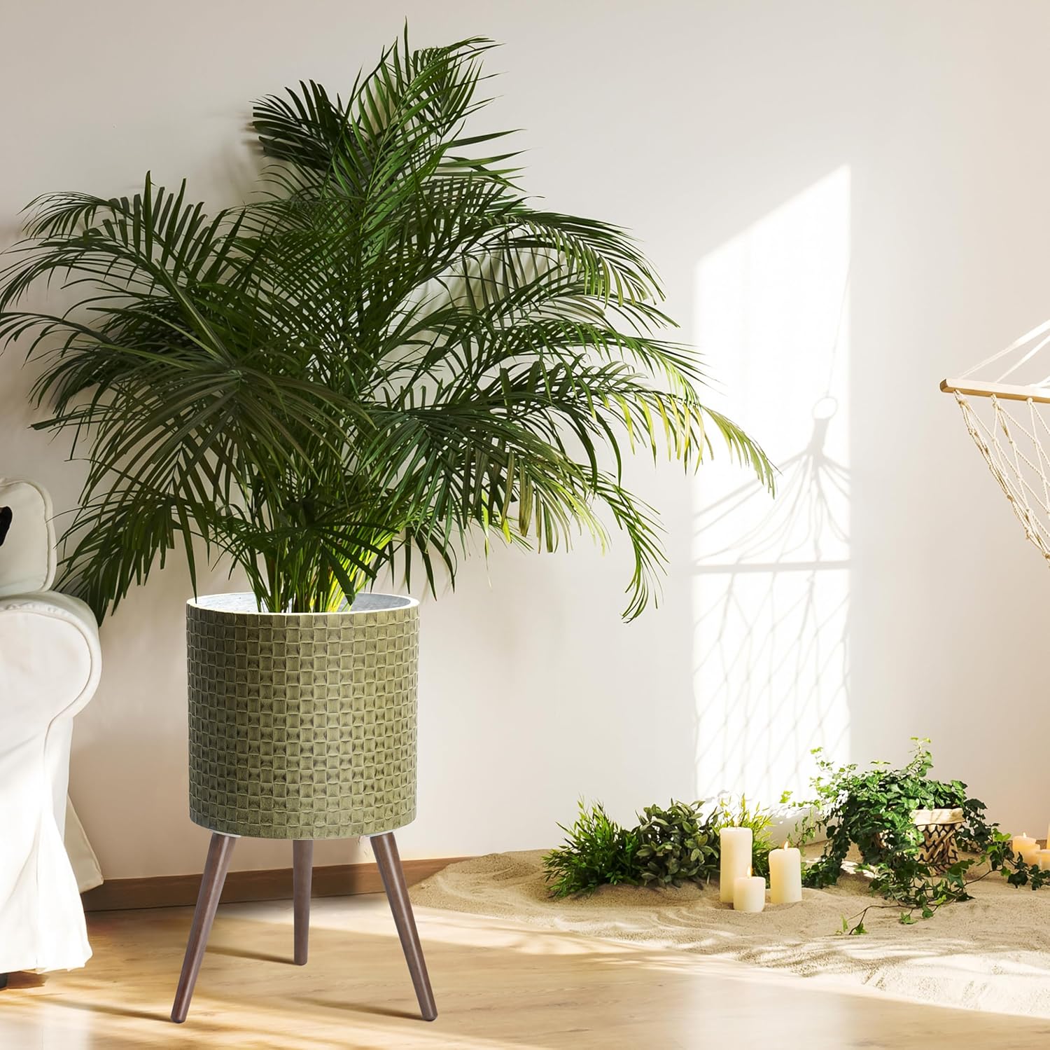 D'vine Dev 14 Inch Modern Geometric Tile Patterned Sleek Planter Pot with Stand, Indoor Outdoor Decorative Plant Holder, Distressed Olive, 88-Z-D-4