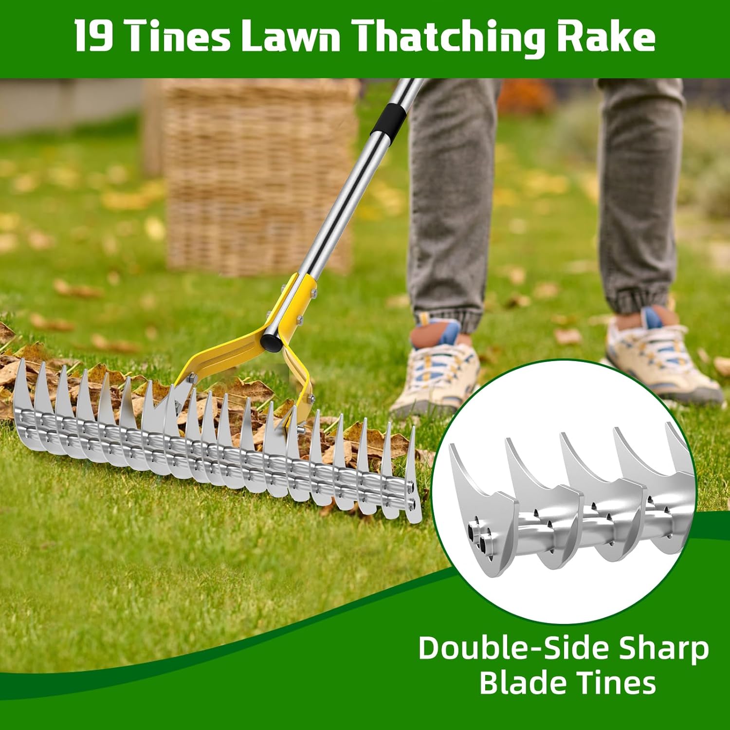 - 19 Curved Steel Tines: Our 15" wide rake head, easily penetrate beneath the surface of your lawn, effectively removing dead grass and organic debris.The tines also lightly loosen the topsoil, enhancing drainage and aeration for optimal grass root development.