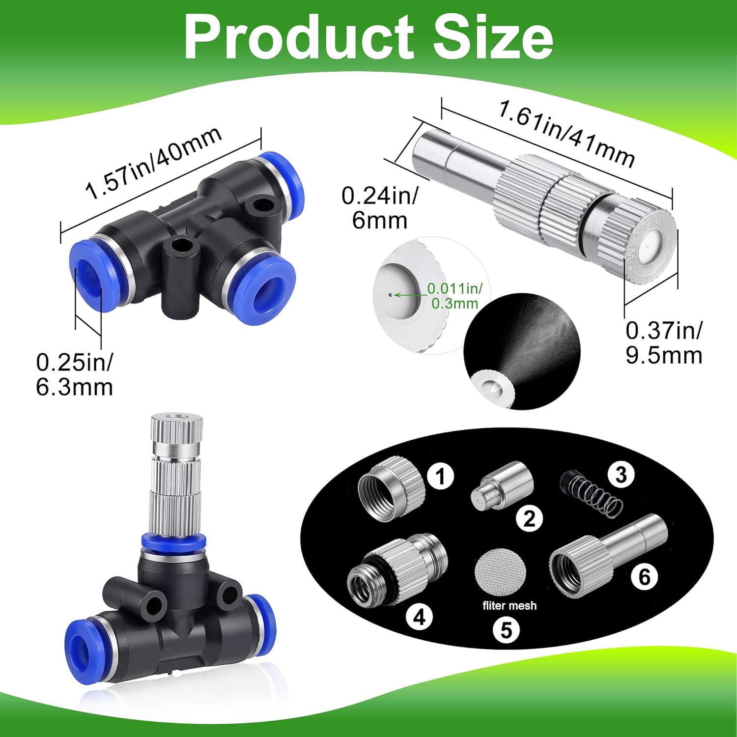 - 【Package Includes】: Mornajina Brass Misting Nozzles Mister Replacement Nozzles Kit includes, ① 10pcs mister nozzles with filter mesh, fit 1/4" Water Misting Nozzle Tees, detachable and washable, Atomizing Misting Sprayer outer diameter: 0.35inch, orifice diameter: 0.3mm (0.012"); ② 10pcs 6.3mm/(1/4") misting nozzle tee fit any 1/4" tube, working pressure: 10-70kg/300-1000psi.