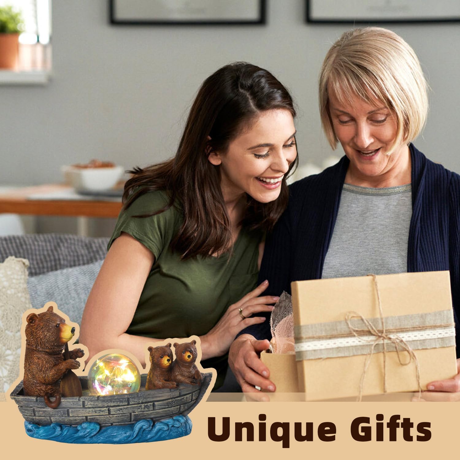 - Mother and Baby Bear Boating Statue:A mother bear rowing a boat,her two children on the other side,with a ball light in the middle,this image is so realistic and cute that it overflows with a warm and caring atmosphere.Day or night,this solar statue will be a beautiful addition to any indoor or outdoor space.
