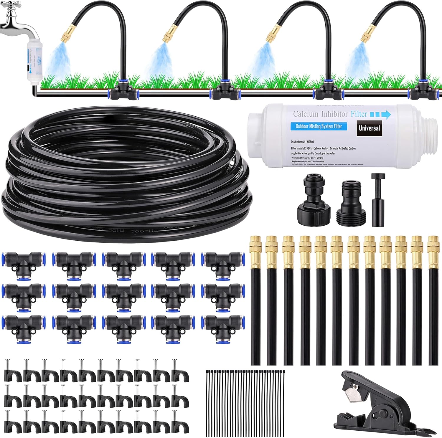 Mornajina Automatic Drip Irrigation Kits Garden Irrigation System, Includes Calcium Inhibitor Filter & 50FT 5/16 inch Irrigation Tubing Hose & 15Pcs 360° Bending Dropper Atomizing Mist Nozzles Tee