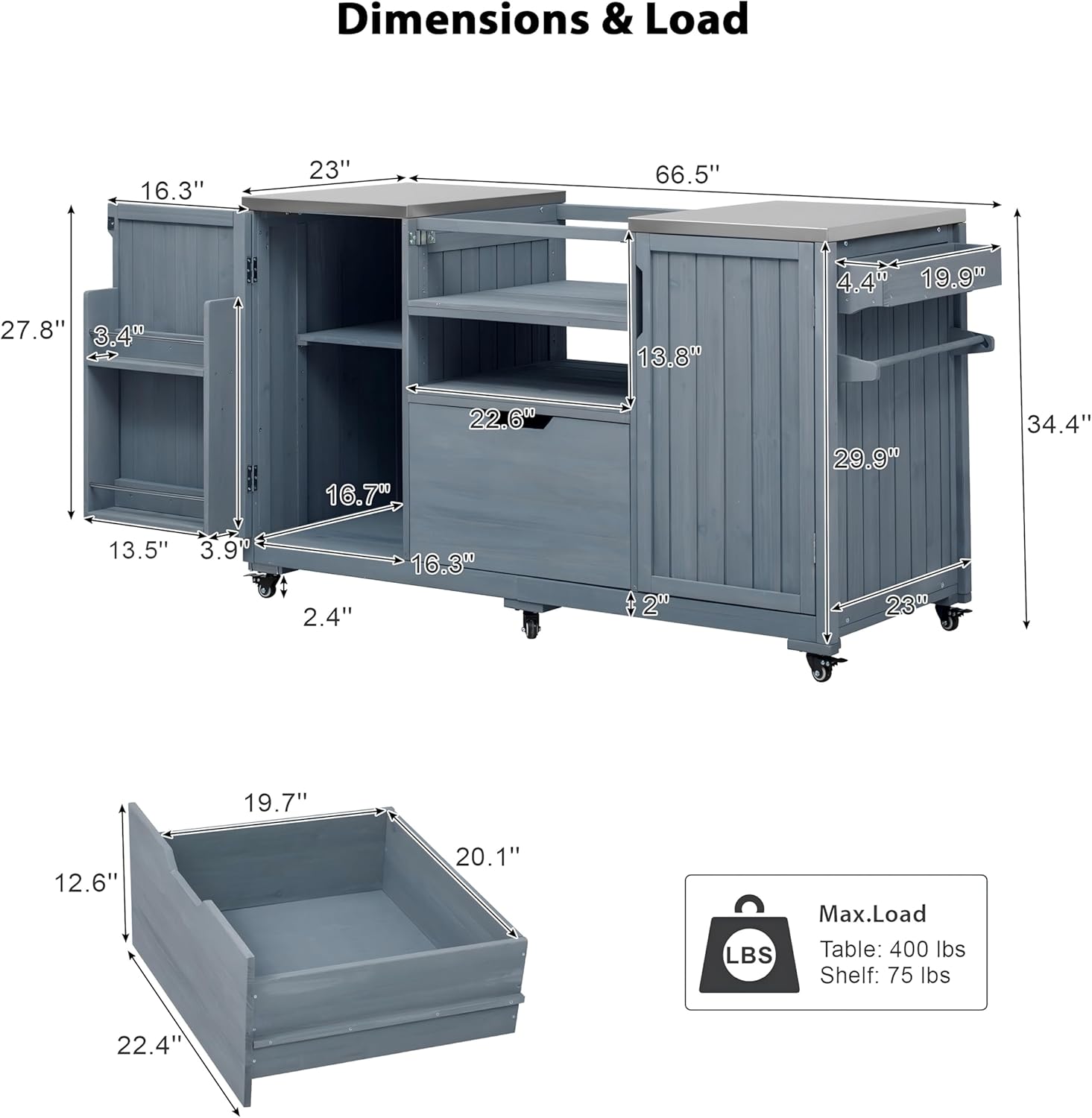 Merax 66.5" Outdoor Grill Table for Big Green Egg, Farmhouse Kitchen Island on Wheels with Stainless Steel Tabletop, Drawer and Spice Rack, Solid Wood Outdoor Storage Cabinet for Backyard, Grey Blue